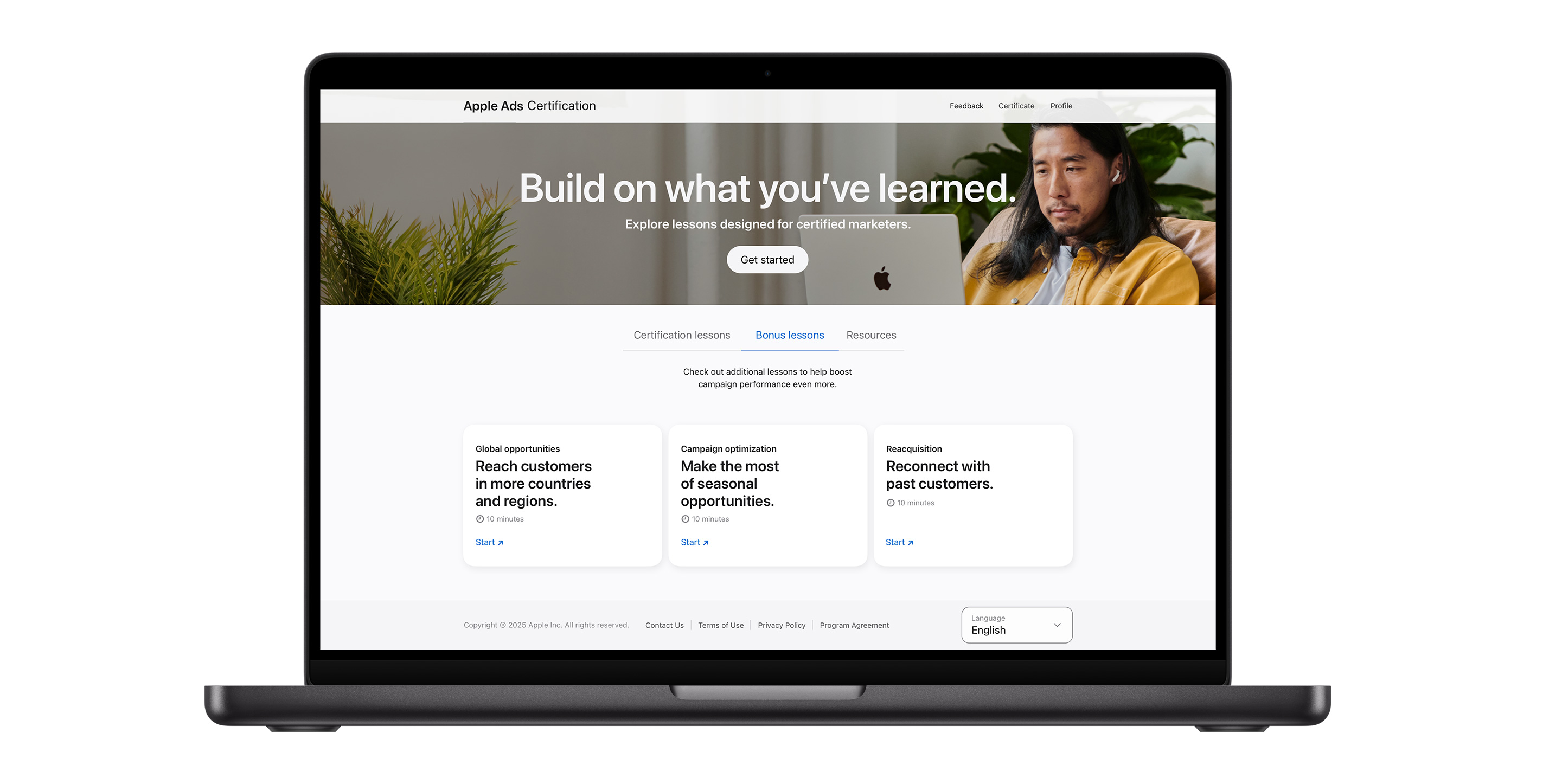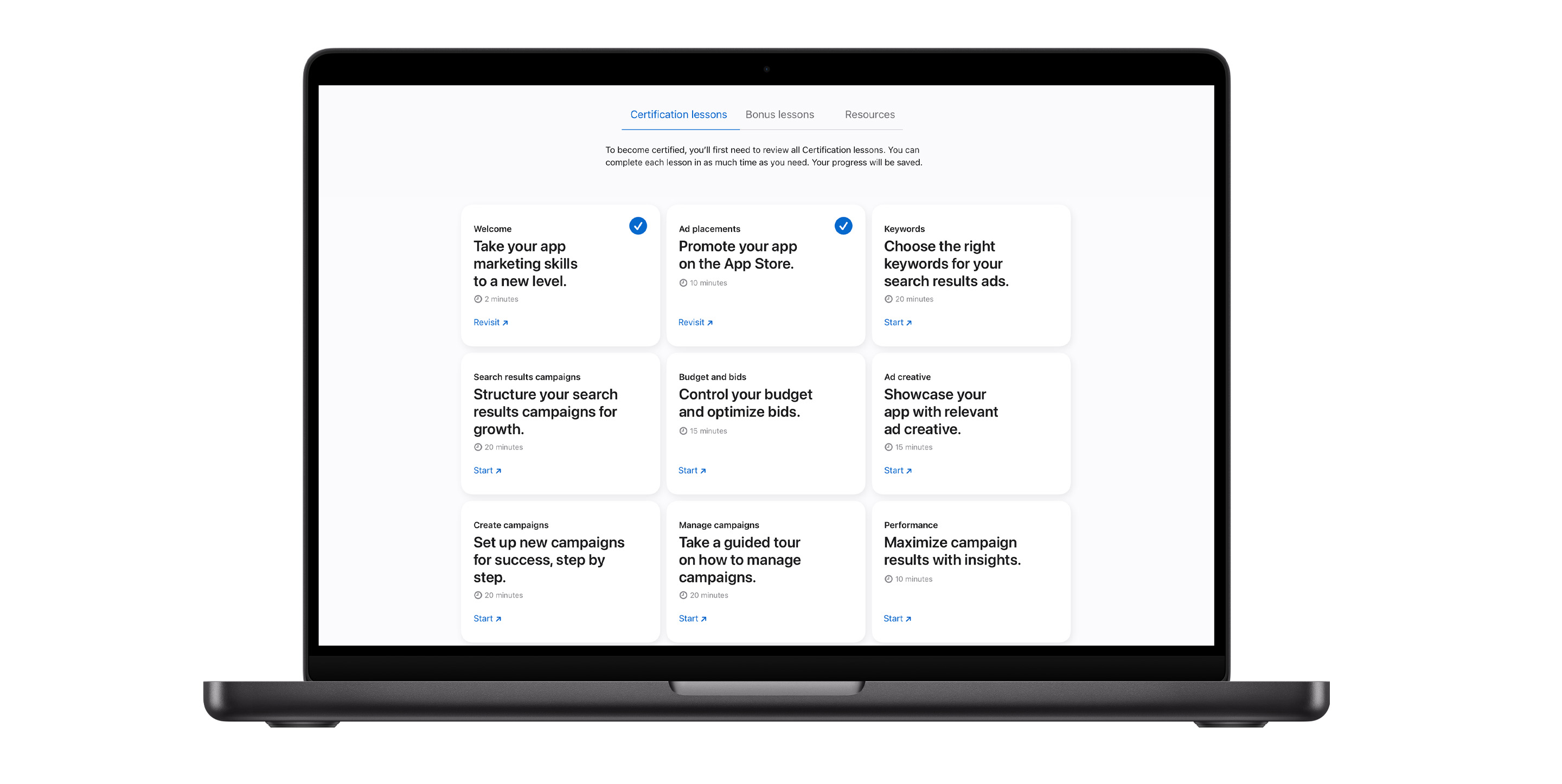 Apple Ads Certification is a free, online course that helps you learn how to effectively promote your app and reach more people across the App Store. Our lessons are filled with proven best practices to help you drive stronger campaign performance, and each one takes about 10–20 minutes to complete.