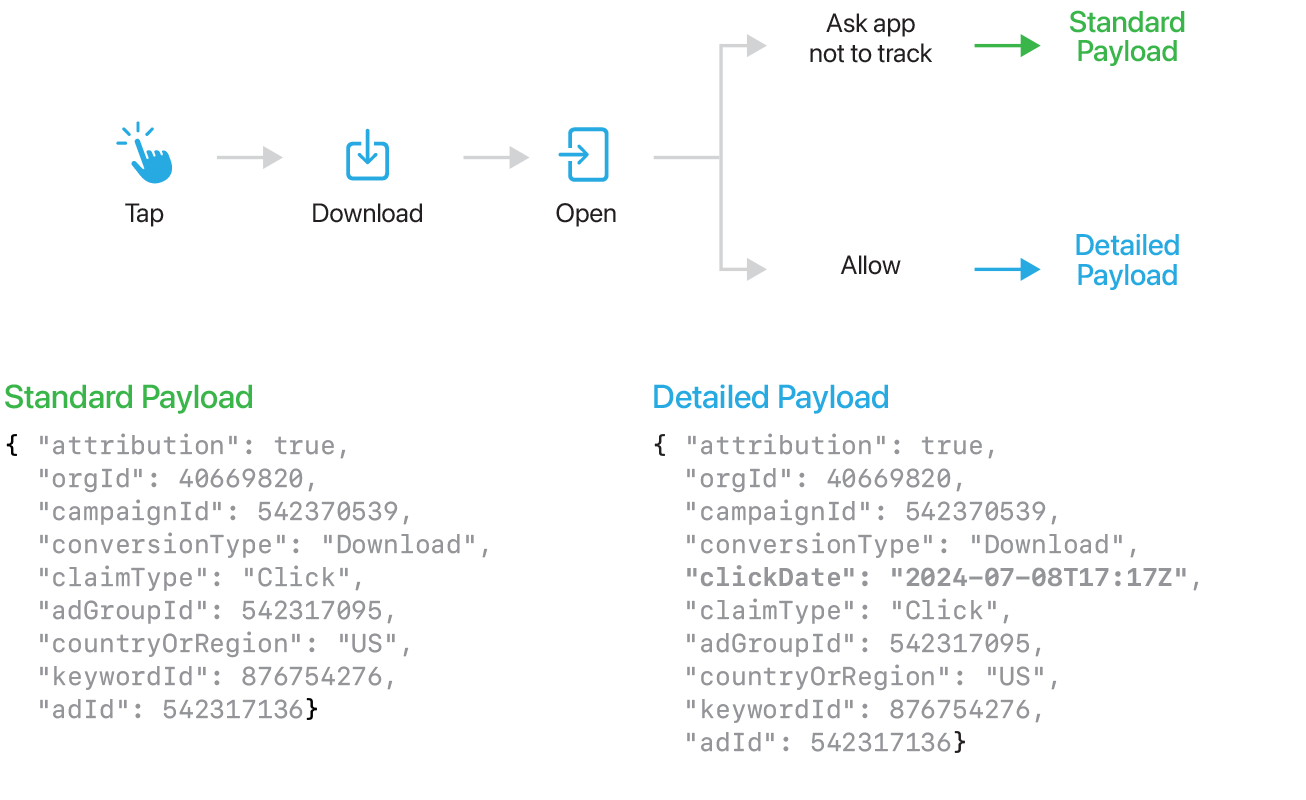 • Different payloads are sent to the advertiser depending on the user’s choice of whether they ask the app not to track them through the ATT prompt. If a user asks an app not to track them, AdServices will return a standard payload without a clickDate or impressionDate. If a user allows an app to track them through the ATT prompt, AdServices will return a detailed payload, with a clickDate or impressionDate.