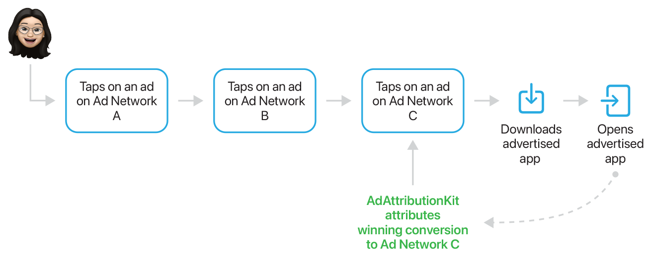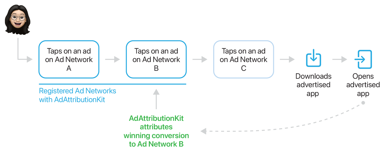As an example, a user may see and click on an ad from Ad Network A, Ad Network B, and Ad Network C, in that order. After the user clicks on the ad from Ad Network A and B, they don’t download the app. But after they click on the ad from Ad Network C, they download and open the app. If all three ad networks are registered with AdAttributionKit, AdAttributionKit will attribute this app conversion to Ad Network C, as it hosted the last ad that the user clicked before converting.