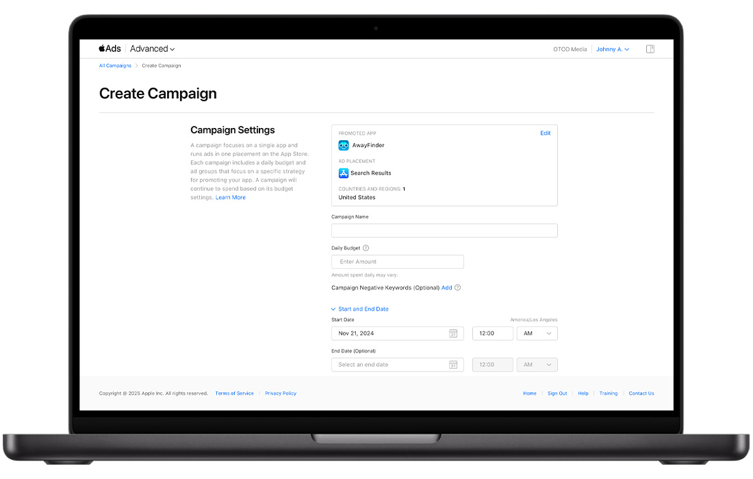 You can schedule your Apple Ads campaigns during campaign creation or by editing your campaign’s settings. Campaign scheduling is helpful for seasonal promotions, time-sensitive marketing efforts, and events. If, for example, you had an app supporting an annual event, you could schedule your campaign to align with it.