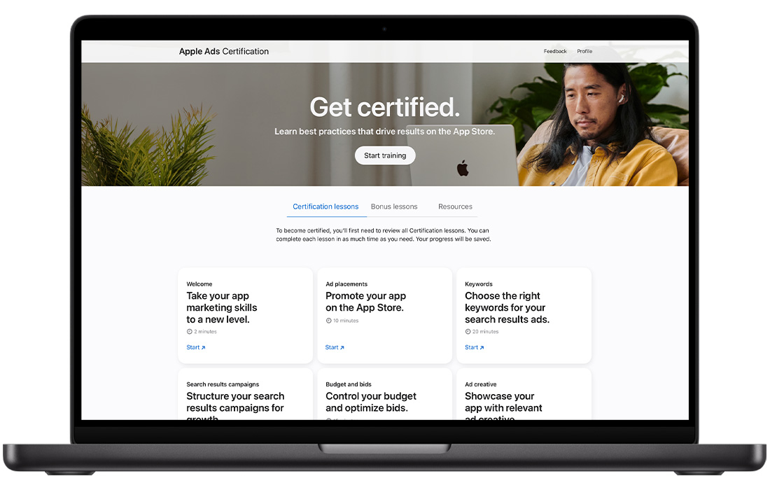 Gain the app marketing skills and knowledge to help you boost campaign performance. Apple Ads Certification is a comprehensive online resource that lets you:
