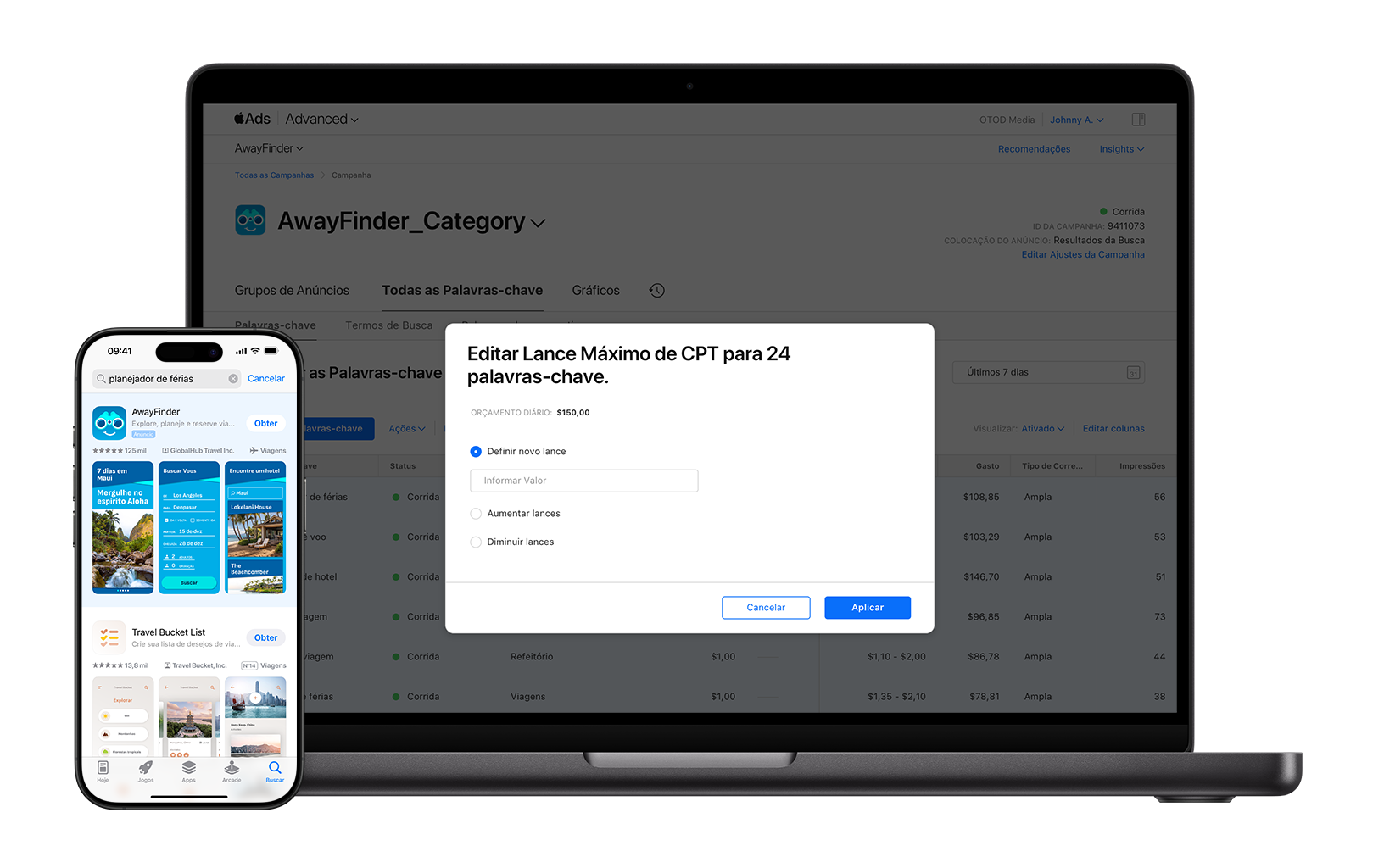 Se você estivesse veiculando uma campanha para o app de viagens AwayFinder, poderia aumentar os lances em palavras-chave de alto desempenho da marca e da categoria durante os meses de verão para alcançar os usuários durante os períodos de pico de viagens.