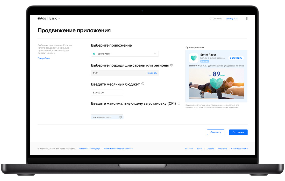 Esse orçamento representa o máximo que você deseja gastar para promover seu app todos os meses e é um orçamento único em todos os países e regiões onde a promoção do seu app será veiculada. O orçamento mensal máximo para o Apple Ads Basic é de US$ 10.000,00 por app, por mês. Maximizaremos o número de instalações até o seu custo máximo por instalação (CPI máximo) e o valor total que você inserir para o seu orçamento.