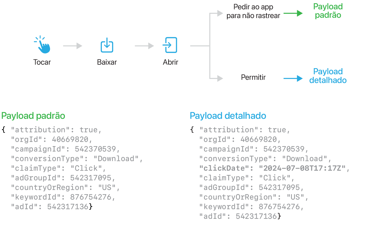 O AdServices envia informações de atribuição ao anunciante quando um usuário abre o app anunciado, fornecendo um dos dois conjuntos de informações, conhecidos como payload. O payload pode ser “padrão” ou “detalhado”, e os dois contêm apenas dados que não identificam o usuário ou o aparelho. A principal diferença entre os dois payloads é o campo clickDate ou impressionDate, que indica a data em que o anúncio foi clicado ou visualizado. O payload detalhado, que inclui esses campos, é enviado somente quando o app obteve permissão do usuário para rastreamento por meio do prompt do App Tracking Transparency (ATT).