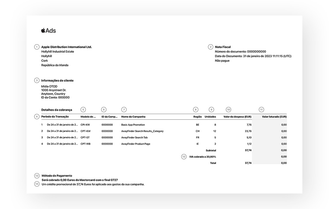 Lembre-se de que o valor que você vê cobrado na nota fiscal pode ser um pouco diferente do gasto mostrado nos painéis no Apple Ads. Isso ocorre porque a cobrança no cartão de crédito é feita de acordo com o UTC, enquanto a conta usa o fuso horário selecionado. O Apple Ads não cobra taxas por transações com cartão de crédito, mas as administradoras de cartão de crédito podem cobrar taxas de transação internacionais. Entre em contato com a administradora do cartão de crédito para saber quando são aplicadas taxas de transação internacional. O Apple Ads não reembolsará nem emitirá créditos pelas taxas de transação internacional cobradas.