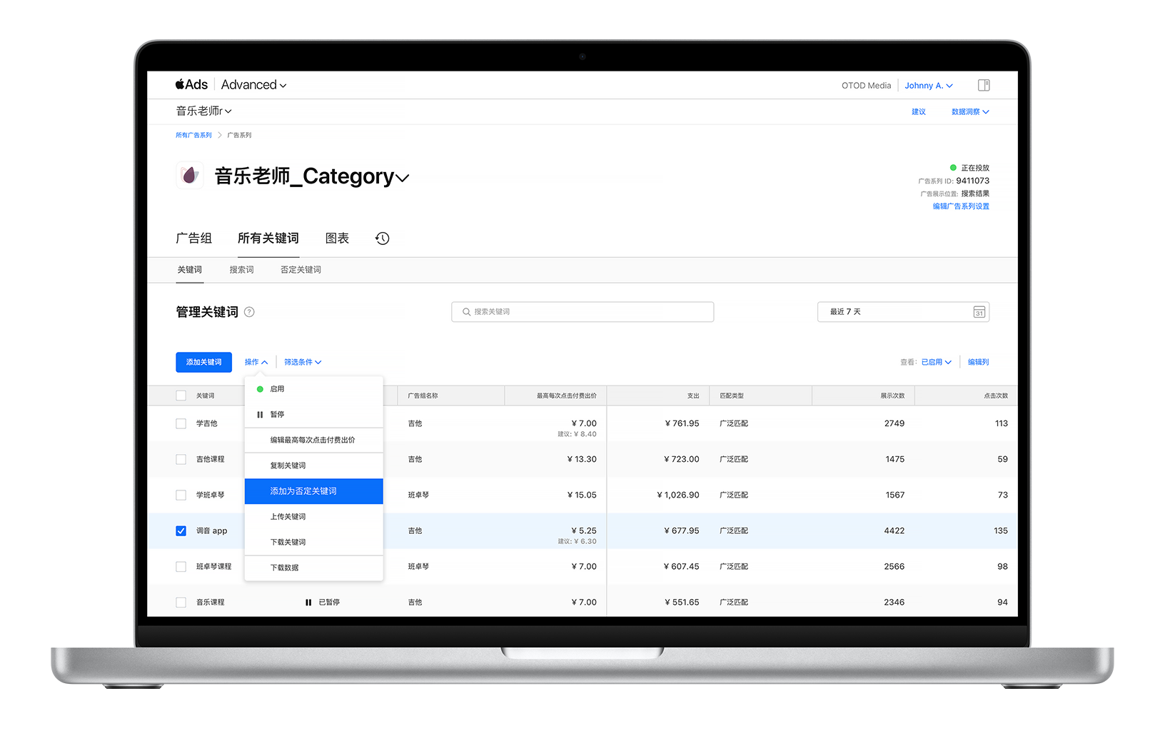 打开了示例 app 音乐老师的“广告系列”信息中心。关键词“调音 app”旁边的复选框被选中,“操作”菜单处于打开状态,“添加为否定关键词”被选中。