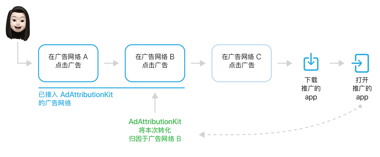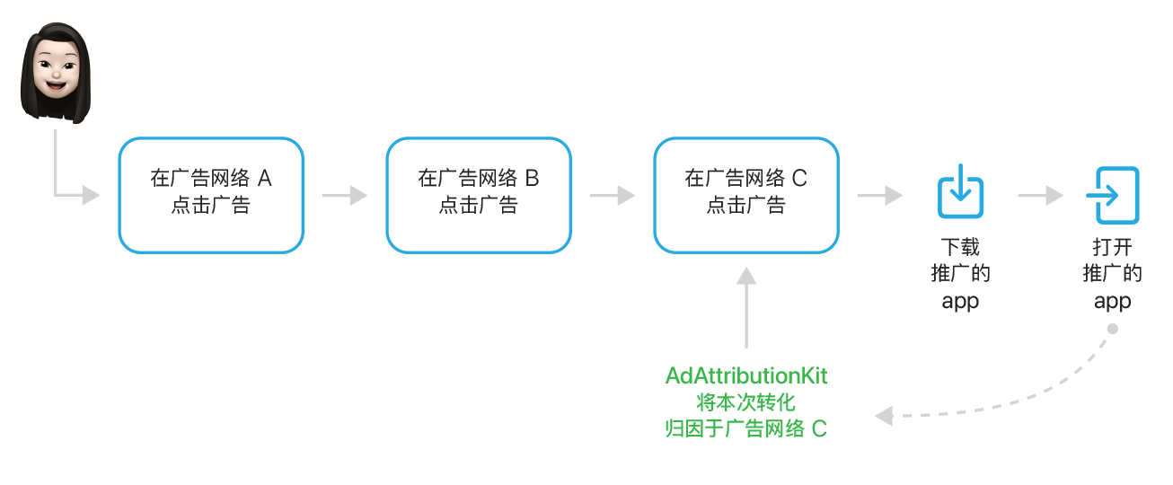 例如,用户依次浏览并点击了广告网络 A、广告网络 B 和广告网络 C 的广告。在点击广告网络 A 和 B 中的广告后,用户并没有下载 app。但在点击广告网络 C 的广告后,用户下载并打开了 app。如果这三个广告网络均接入了 AdAttributionKit,那么 AdAttributionKit 会将此次 app 转化归因于广告网络 C,因为它提供了用户转化前最后点击的广告。