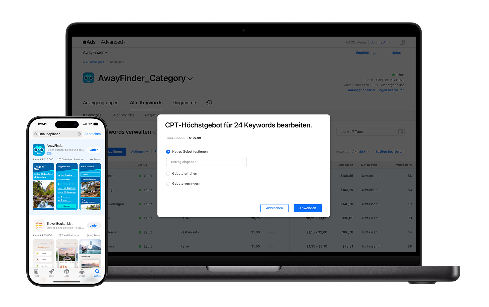 Wenn du eine Kampagne für die Reise-App „AwayFinder“ durchführen würdest, könntest du in den Sommermonaten die Gebote für leistungsstarke Marken- und Kategorie-Keywords erhöhen, um sicherzustellen, dass du Nutzer:innen während der Hauptreisezeiten erreichst.