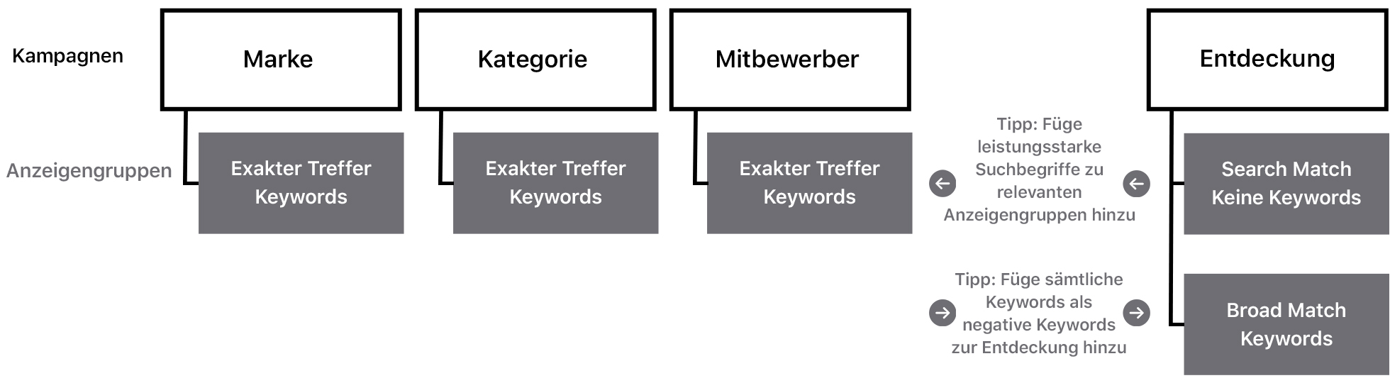 Folgende vier Kampagnentypen stehen dir in deinem Account zur Verfügung: Marke, Kategorie, Mitbewerber und Entdeckung. Jeder Kampagnentyp konzentriert sich auf ein anderes Keywordthema und verwendet spezifische Strategien für Anzeigengruppen, Match Types und Gebote.