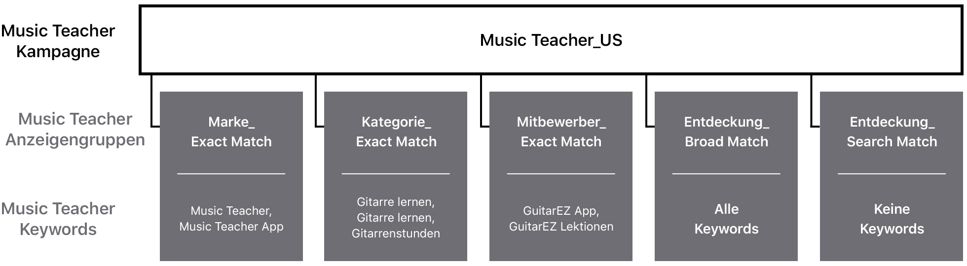 Wenn du einzelne Kampagnen erstellst, um Regionen oder Budgets separat zu verwalten, kannst du Anzeigengruppentypen einrichten, die den oben beschriebenen Kampagnentypen ähneln. Erstelle Anzeigengruppen für Broad Match Keywords in Marken-, Kategorie-, Mitbewerber- und Entdeckungskampagnen sowie eine Anzeigengruppe in einer Entdeckungskampagne, für die „Search Match“ aktiviert ist. So könnte diese Struktur aussehen, wenn du eine App zum Lehren von Streichinstrumenten namens „Music Teacher“ bewerben würden.