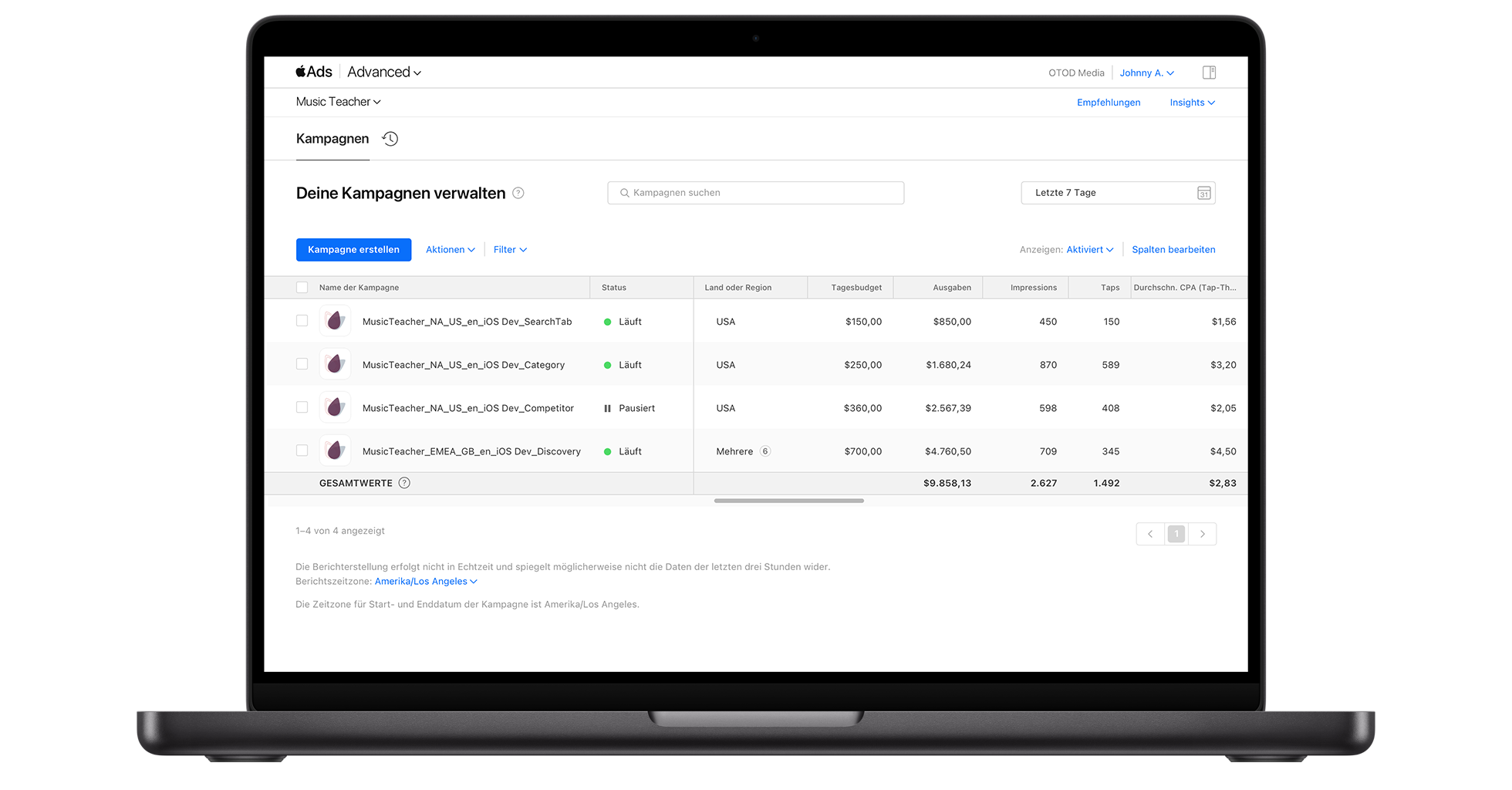 Du legst ein Budget auf der Kampagnenebene fest und wählst die App Store Länder und Regionen aus, in denen die Anzeigen geschaltet werden sollen. Innerhalb der Kampagnen erstellst du Anzeigengruppen, in denen du Keywords auswählen, Gebote festlegen und Anzeigenvarianten einrichten kannst.