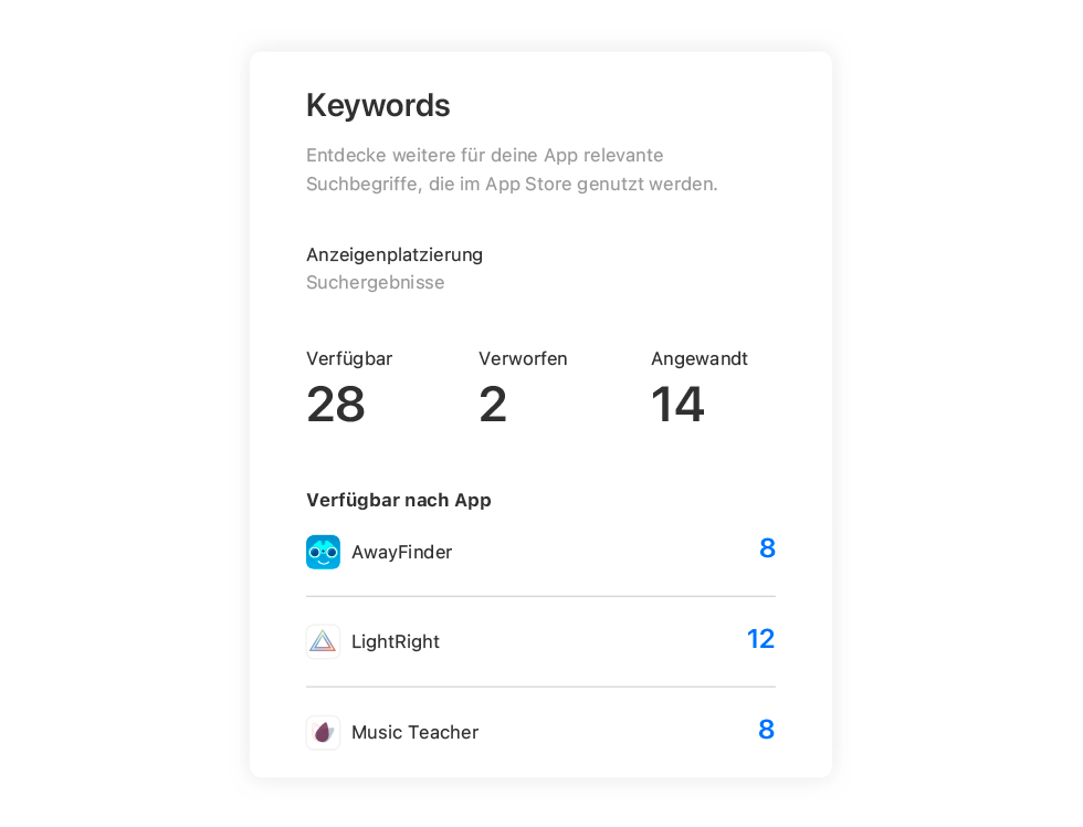 Keywords sind entscheidend für die Auffindbarkeit einer App. Sie bestimmen, wie deine Anzeige den Suchanfragen im App Store zugeordnet wird. Die effektive Verwendung von Keywords kann die Leistung von Suchergebniskampagnen steigern und dir helfen, Wachstumspotenziale aufzudecken. Nutze die folgenden Vorschläge, um die bestmöglichen Ergebnisse zu erzielen.