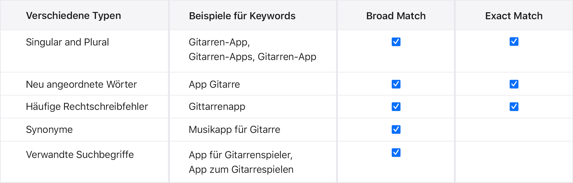 Nachfolgend findest du die Variationen der Match Types für das Keyword „Gitarren-App“ für unsere Beispiel-App „Music Teacher“.