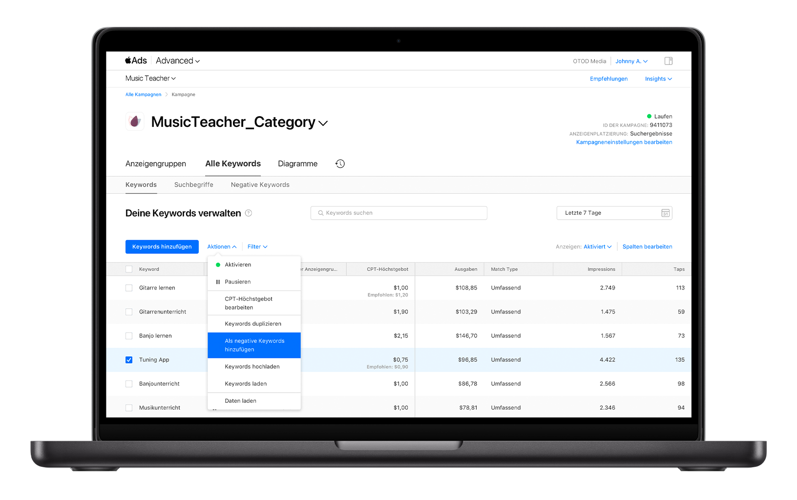 Erschließe das Potenzial leistungsstarker Keywords. Durch die regelmäßige Überprüfung der Keywordperformance kannst du überwachen, welche Suchbegriffe am besten abschneiden. Und du sorgst dafür, dass genügend Budget vorhanden ist, damit die Keywords ihre maximale Wirkung entfalten. Möglicherweise möchtest du die Gebote für bestimmte leistungsstarke Suchbegriffe erhöhen, um festzustellen, ob sich mehr Impressions, Taps und Downloads erzielen lassen. Oder du möchtest die Gebote für Keywords mit geringerer Leistung neu bewerten. Weitere Einzelheiten findest du auf der Seite „Best Practices“ unter Gebote.