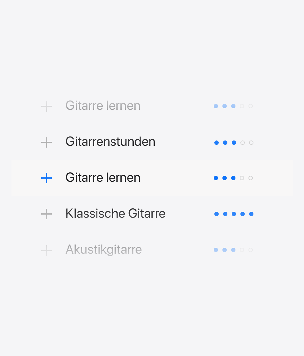 spezifische Keywords. Sagen wir, du bewirbst eine App zum Unterrichten von Saiteninstrumenten namens Music Teacher. Du solltest sowohl allgemeine als auch spezifische Begriffe wie die folgenden Beispiele verwenden, damit deine Anzeige bei mehr Suchanfragen im App Store erscheint.