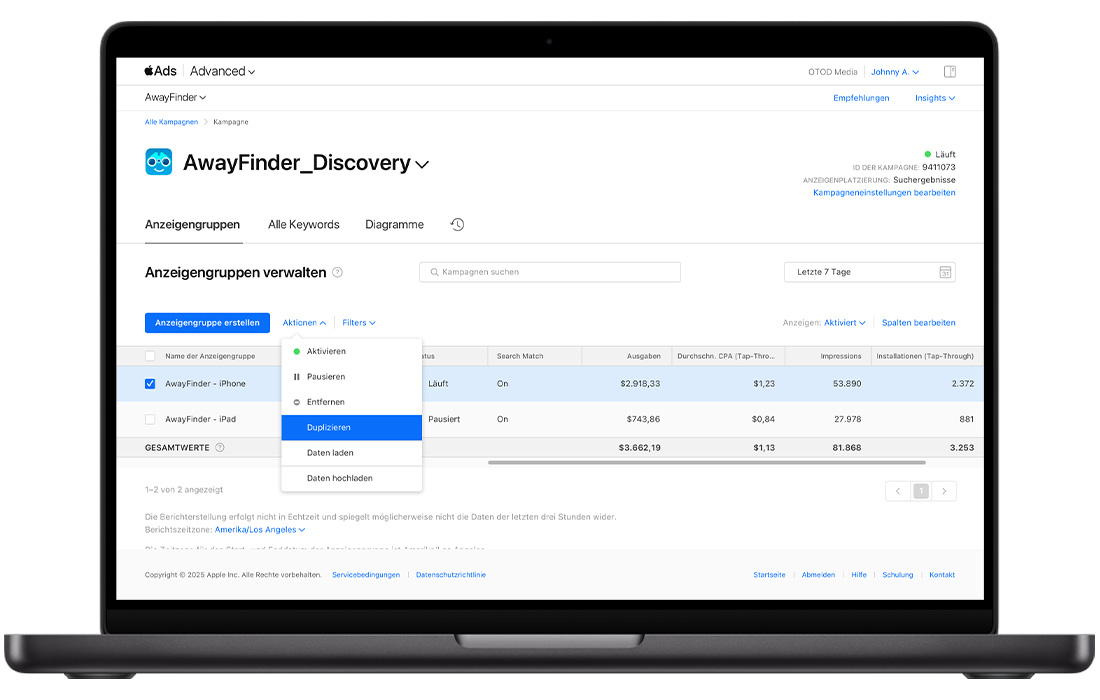 - weil die Zielkampagne eine andere App, andere Länder und Regionen, oder andere Geräte verwendet.
