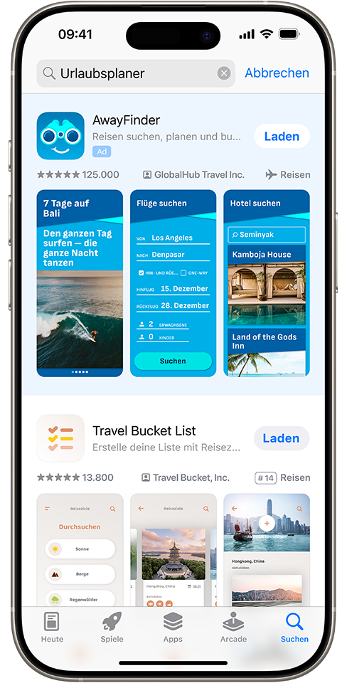 Suchergebnisanzeigen helfen Kund:innen dabei, deine App zu entdecken, wenn sie nach Apps zum Herunterladen suchen. Deine Anzeige kann den Nutzer:innen im App Store an der Spitze der Suchergebnisse eingeblendet werden.