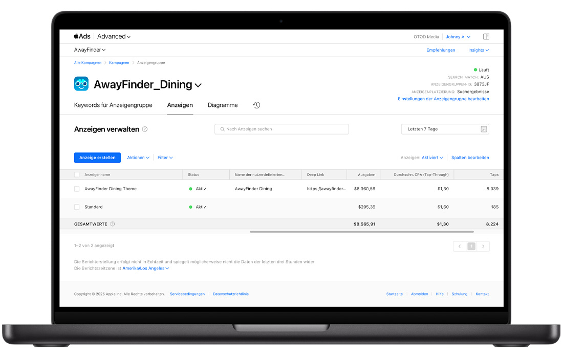 - Aktuelle und vergangene Leistungsdaten einsehen für alle deine Anzeigenvarianten, einschließlich deiner Standard-Suchergebnisanzeige, deiner nutzerdefinierten Anzeigen und deiner zuvor erstellten Creative Sets. Du kannst auch wichtige Kennzahlen wie Impressions, Taps, Durchschnitts-CPT (Cost-Per-Tap), Installationen und mehr einsehen.