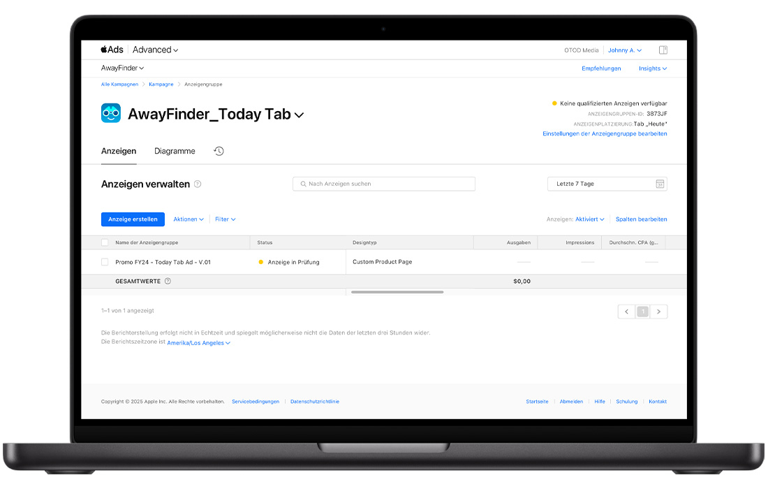 - Neue Anzeigen erstellen die Nutzer:innen auf genehmigte Custom Product Pages führen, die du in App Store Connect eingerichtet hast. Bevor deine Anzeige im Tab „Heute“ ausgeführt werden kann, müssen Symbol, Name, Untertitel und Custom Product Pages deiner App von Apple Ads überprüft und genehmigt werden.