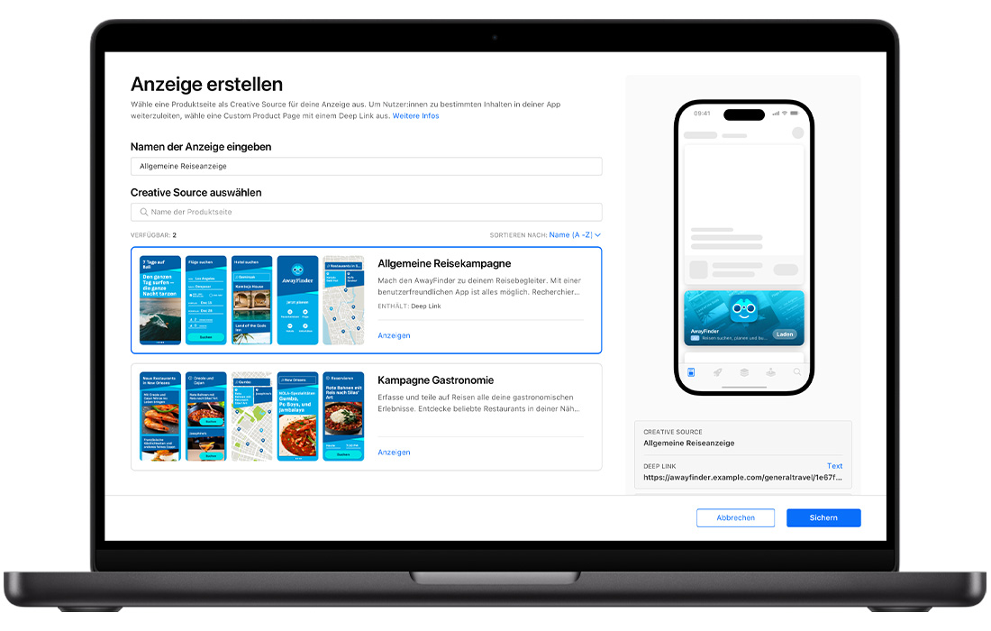 Nachdem deine Custom Product Page eingerichtet ist und in App Store Connect genehmigt wurde, kannst du in Apple Ads mit der Kampagnenerstellung für den Tab „Heute“ beginnen. Wenn du in App Store Connect mehrere Custom Product Pages eingerichtet hast, kannst du während der Kampagnenerstellung eine als Tippziel und Anzeigenhintergrund auswählen. Du kannst auch eine Custom Product Page mit einem Deep Link auswählen, der die Nutzer:innen genau an die gewünschte Stelle in deiner App weiterleitet. Deep Links sind auf Geräten mit iOS 18 und neuer verfügbar.
