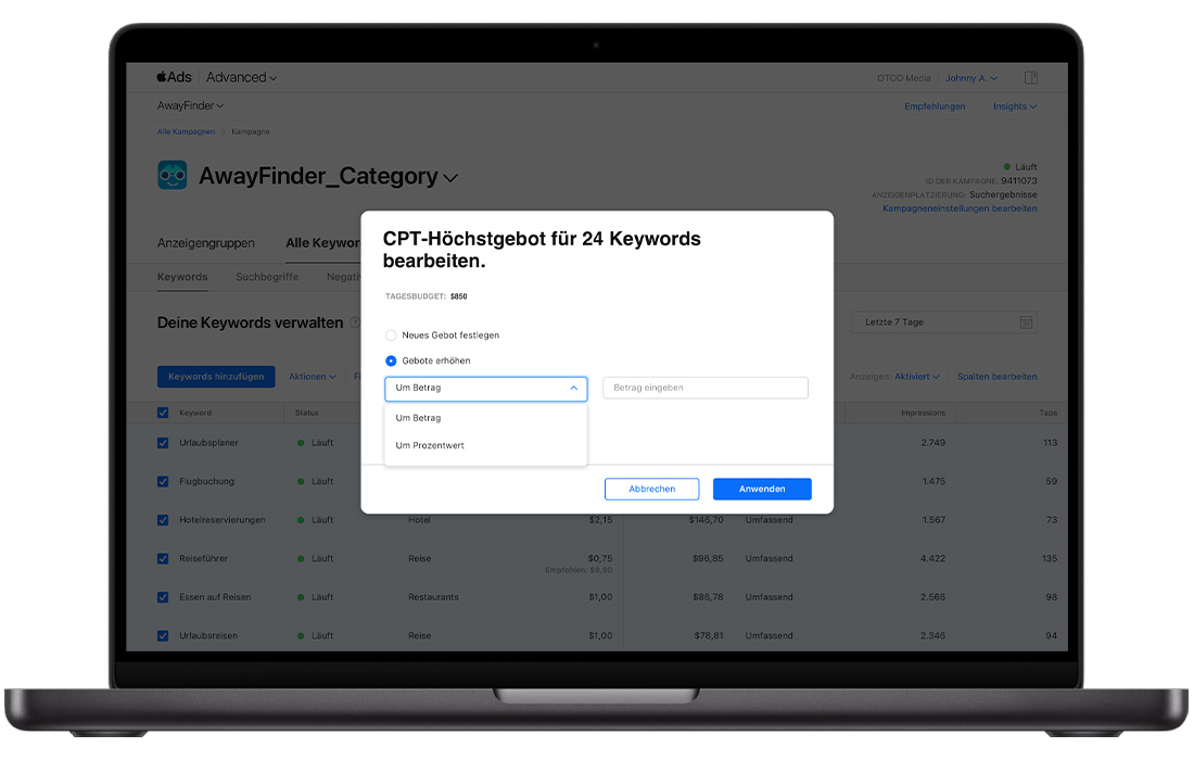Wenn du eine neue Kampagne oder Anzeigengruppe in Apple Ads erstellst, musst du unter anderem dein Cost-Per-Tap-Höchstgebot (CPT-Höchstgebot) hinzufügen. Dies ist der Höchstbetrag, den du für einen Tap auf deine Anzeige maximal bezahlen würdest.