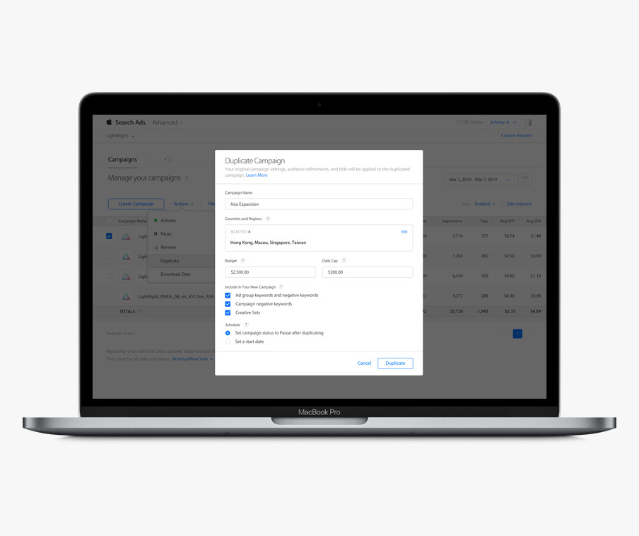 Apple Search Ads Advanced Nutzer:innen können ab sofort Kampagnen duplizieren, um sie an neue Zielgruppen, Sonderaktionen oder Märkte anzupassen, und für mehrere Keywords gleichzeitig die Gebote ändern.