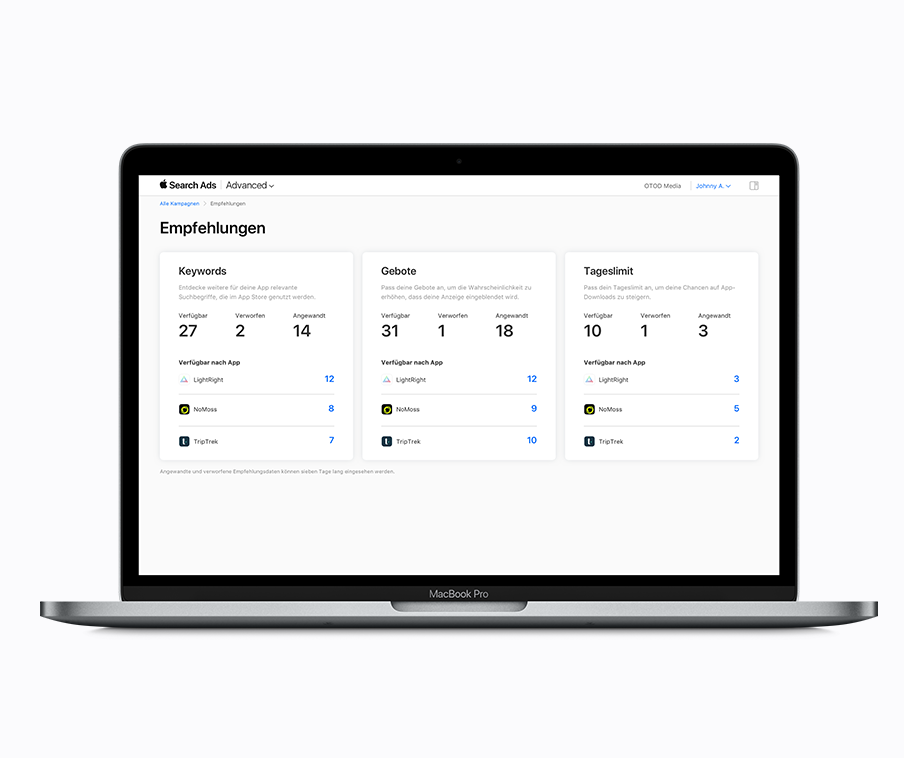 Auf der neuen Empfehlungsseite in Apple Search Ads Advanced findest du mühelos umsetzbare Tipps zu Keywords, Geboten und Tageslimits.