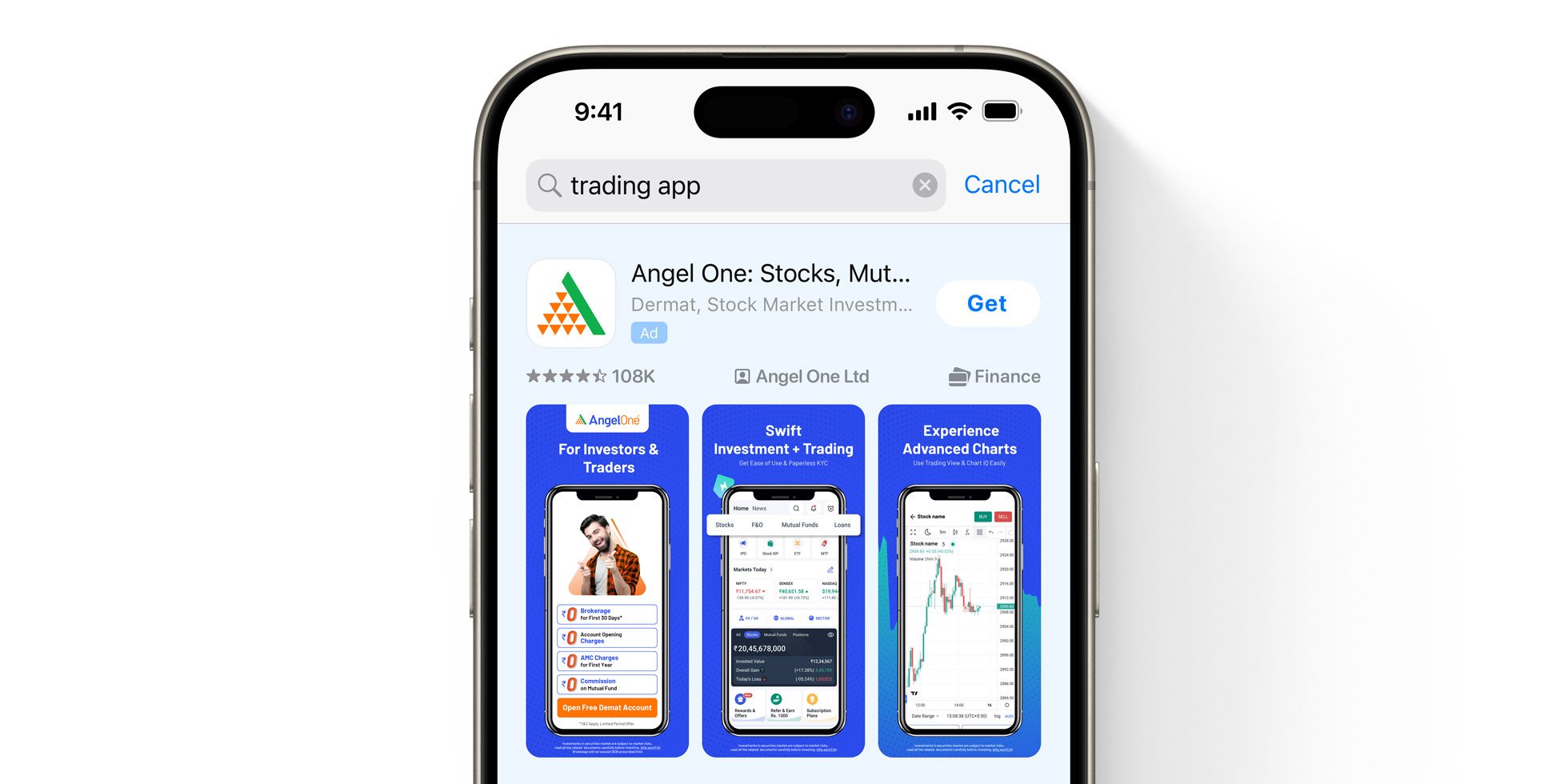 Um die Suchergebniskampagnen zu ergänzen und noch mehr neuer Zielgruppen auf sich aufmerksam zu machen, investierte Angel One in mehrere Anzeigenplatzierungen überall im App Store. Mit Anzeigen im Tab „Suchen“ konnten sie hochrelevante Zielgruppen in der Entscheidungsphase beeinflussen. „Durch Kampagnen im Tab ‚Suchen‘ konnten wir unsere App als glaubwürdige, vertrauenswürdige Option im weiten Feld der Finanz-Apps positionieren. Die prominente Platzierung in den App Store Suchergebnissen hat unsere Marke sichtbarer gemacht, Entscheidungen beeinflusst und die Absicht potenzieller Nutzer:innen erfasst, die aktiv nach Finanz- und Investment-Apps suchen“, sagt Dasgupta.
