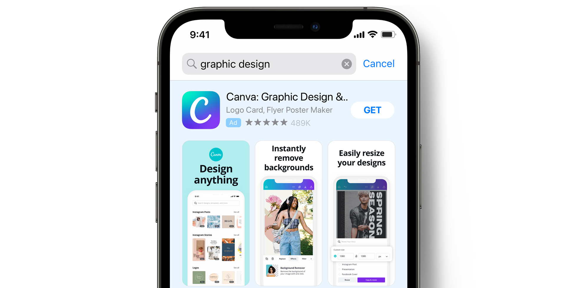 Apple Ads Daten zu Tap-Through-Raten und Conversion Rates auf Keywordebene haben Canva auch geholfen, die Metadaten auf der App Store Produktseite zu optimieren, was die organische Sichtbarkeit der App im App Store deutlich verbessert hat. Parallel sorgte Apple Ads für eine höhere Installationsrate.
