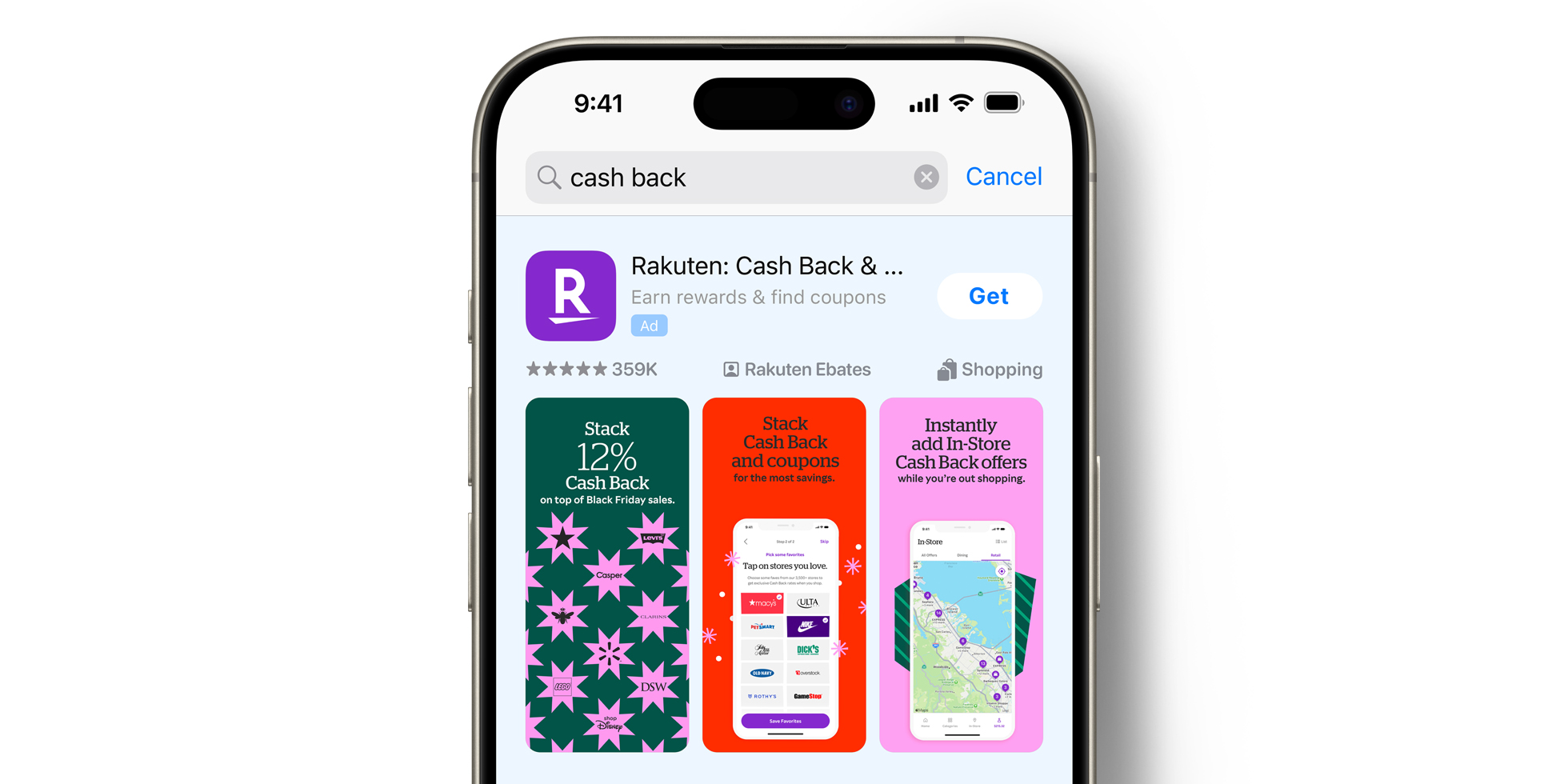 Um die Sichtbarkeit bei jedem Schritt des Kundenerlebnisses zu maximieren, entwickelte das Rakuten-Team eine Apple Ads Strategie mit mehreren Platzierungen im gesamten App Store, wodurch die Markenbekanntheit gesteigert und die Zahl der Impressions während Cyber 5 verdreifacht wurde. Anzeigen auf dem Tab „Heute“ trugen dazu bei, die Auffindbarkeit der App bei einer breiteren Zielgruppe zu erhöhen, die an Angeboten und Ersparnissen interessiert war. Mit Kampagnen im Tab „Suchen“ konnte das Team von Rakuten die Kaufbereitschaft bei mehr Käufer:innen beeinflussen.