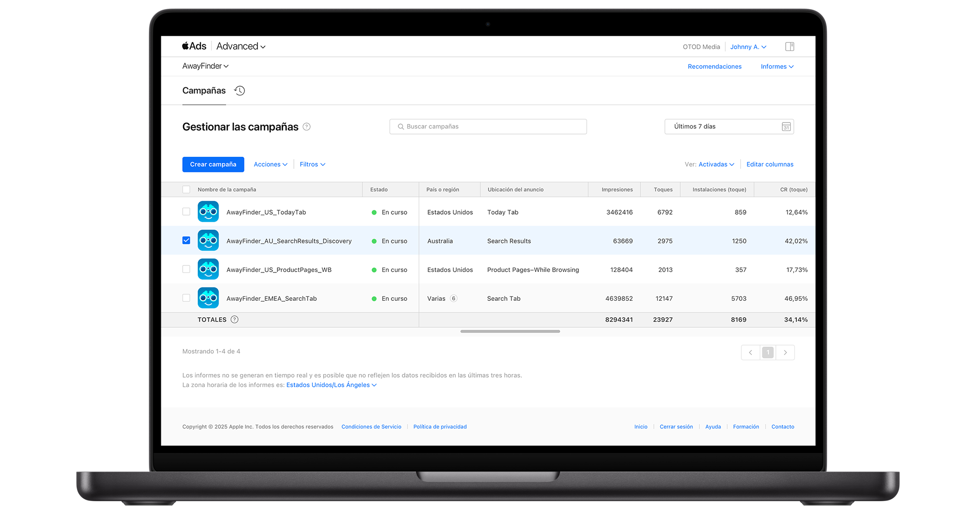 Las estadísticas de la publicación de anuncios en las distintas ubicaciones de Apple Ads crearon un puente de comprensión y colaboración entre nuestros equipos de desarrollo de la marca, búsqueda y diseño. Una estrategia de varias ubicaciones con Apple Ads ayudó a unir nuestros objetivos de forma interna, creando una sinergia muy valiosa entre la visibilidad de la marca y un marketing centrado en las conversiones.