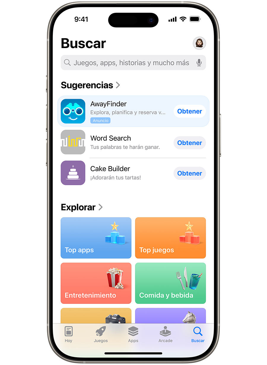 La mayoría de las personas encuentran y descargan apps en el App Store a través de búsquedas, por lo que conseguir que tu app aparezca en la parte superior de los resultados de búsqueda es una prioridad. Casi el 65 % de las descargas se producen directamente después de una búsqueda,2 así que sigue estos consejos para reforzar tus campañas y ayudar a que la gente descubra tu app.