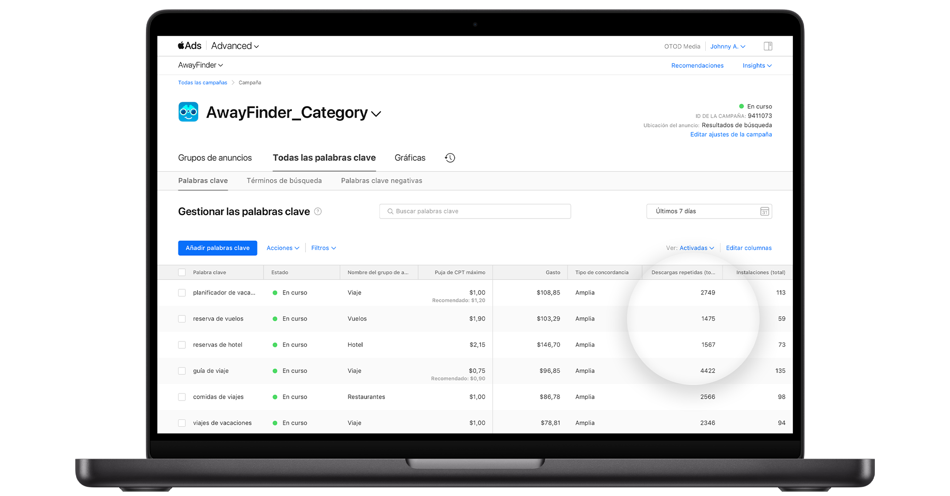 Apple Ads incluye un indicador de descargas repetidas en los recuentos de instalaciones que se ven en los paneles Todas las palabras clave y Palabras clave del grupo de anuncios. La descarga repetida se produce cuando un cliente descarga tu app, la elimina y la vuelve a descargar después de tocar un anuncio en el App Store. O cuando descargan la misma app en otro dispositivo. Supervisa el indicador de descargas repetidas para entender qué palabras clave son más eficaces entre los usuarios que descargan de nuevo la app y para tomar decisiones informadas sobre la optimización.