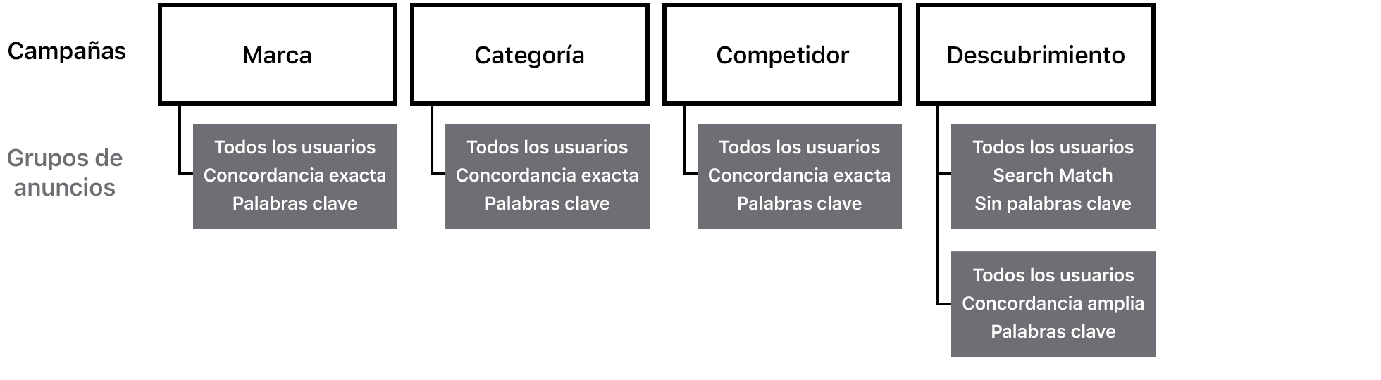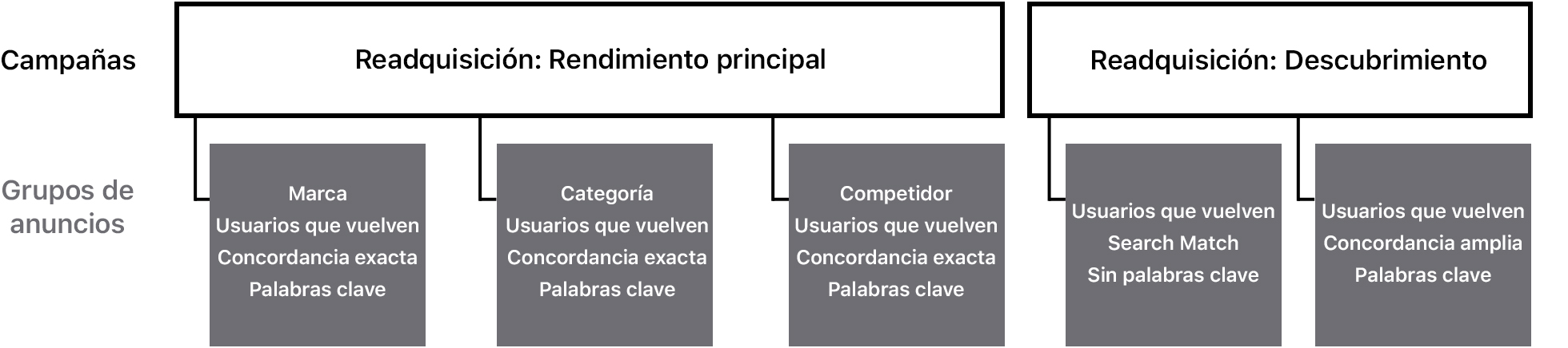 Para gestionar tu presupuesto de readquisición por separado, crea campañas dedicadas con todos los grupos de anuncios configurados para el tipo de cliente «Usuarios que descargan de nuevo la app». Esta estructura puede ayudarte a personalizar las palabras clave, las pujas y los anuncios para los clientes anteriores. A medida que aprendas qué términos funcionan bien en tus grupos de anuncios de descubrimiento, trasládalos a los otros grupos de anuncios como palabras clave.