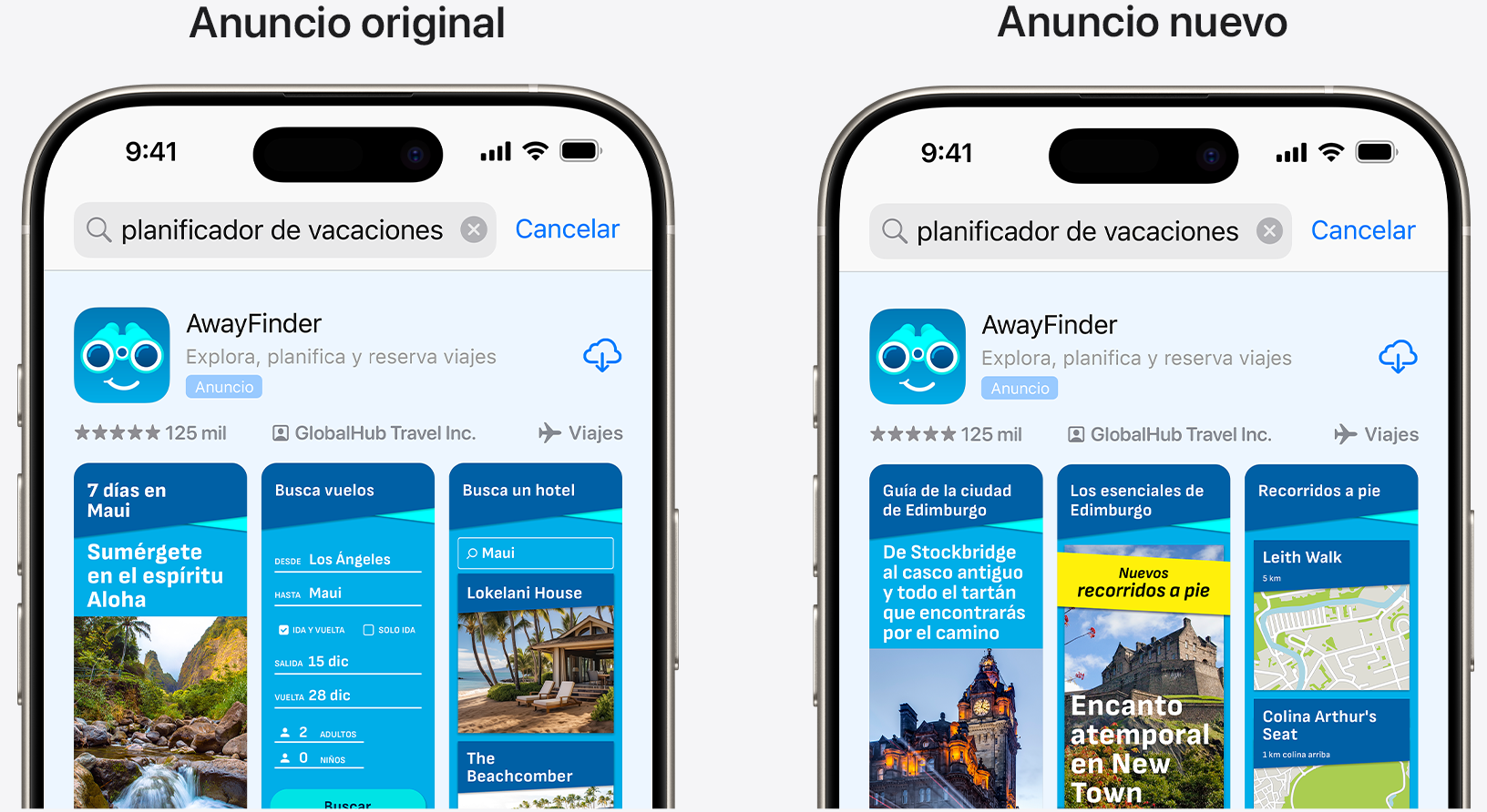 Supongamos que tienes una app de viajes llamada AwayFinder y quieres mostrar una nueva prestación de visitas guiadas a pie. Puedes cargar nuevos materiales en App Store Connect para que tu anuncio promocione esta nueva función tanto a clientes nuevos como a clientes previos.