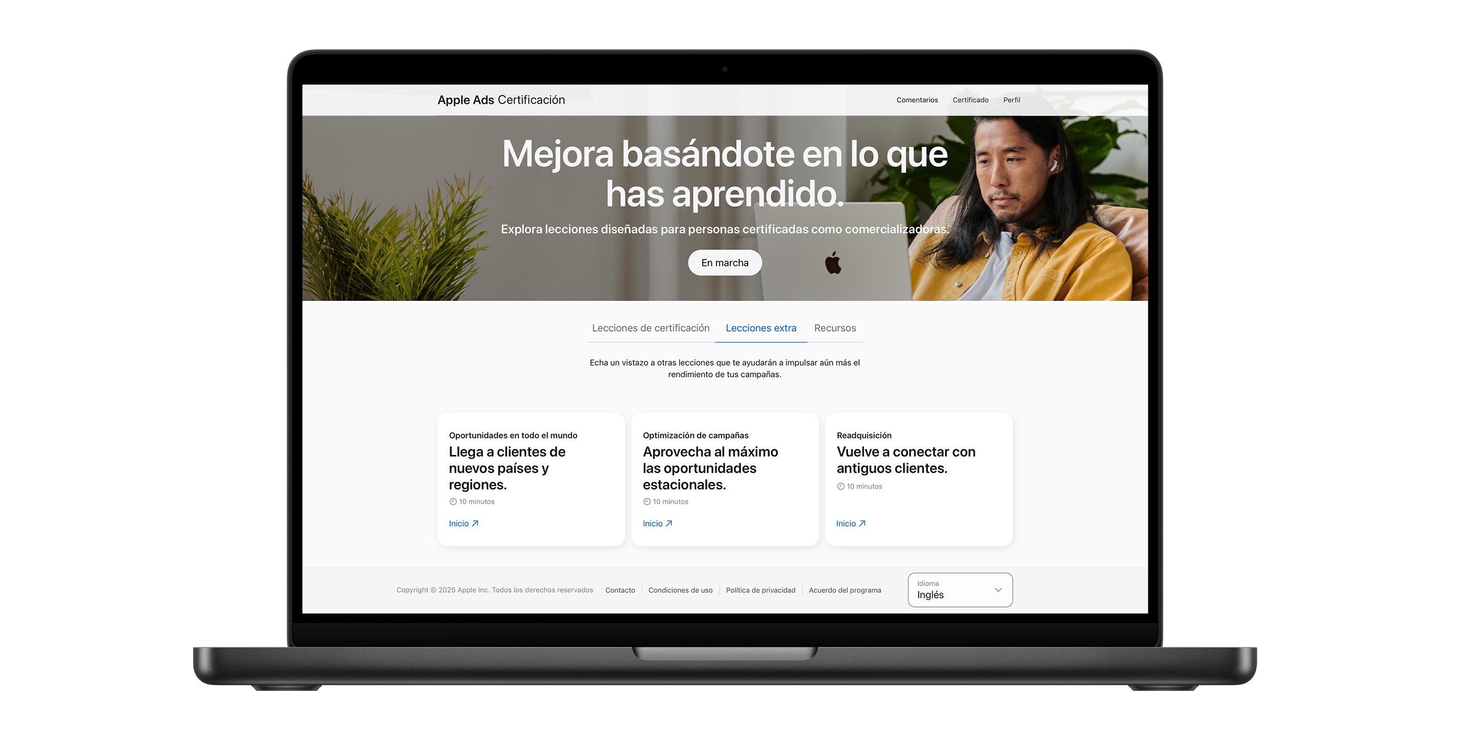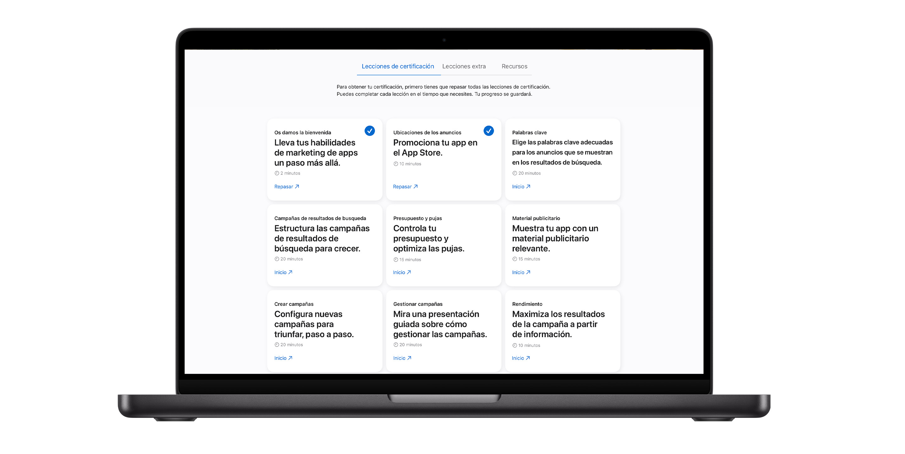 La certificación de Apple Ads es un curso gratuito en línea que te ayuda a aprender a promocionar tu app de manera eficaz y llegar a más personas en el App Store. Nuestras lecciones están repletas de prácticas recomendadas probadas para ayudarte a mejorar el rendimiento de tus campañas. Cada una de ellas te llevará entre 10 y 20 minutos.