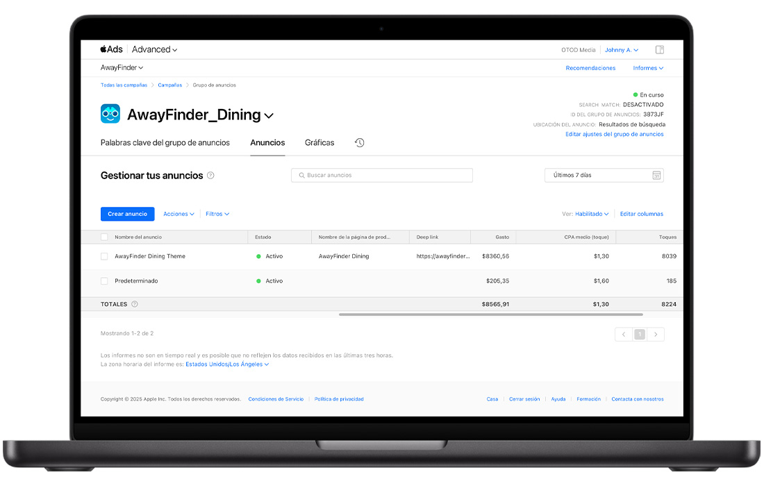- Controlar los datos de rendimiento actuales e históricos para todas las variantes de anuncios, incluido el anuncio para los resultados de búsqueda por defecto, los anuncios personalizados y los Creative Sets previamente creados. Puedes ver indicadores clave como las impresiones, los toques, el cost-per-tap (CPT), las instalaciones y mucho más.