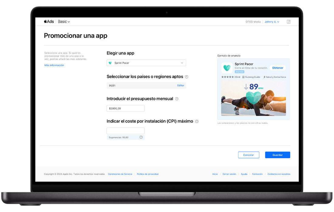 Este presupuesto representa la cantidad más alta que quieres gastar para promocionar la app cada mes natural, y es un presupuesto único en todos los países y regiones donde se promocionará la app. El presupuesto máximo mensual para Apple Ads Basic es de 10 000 USD por app y mes. Maximizaremos el número de instalaciones hasta tu coste por instalación máximo (CPI máximo) y la cantidad total que introduzcas en tu presupuesto.
