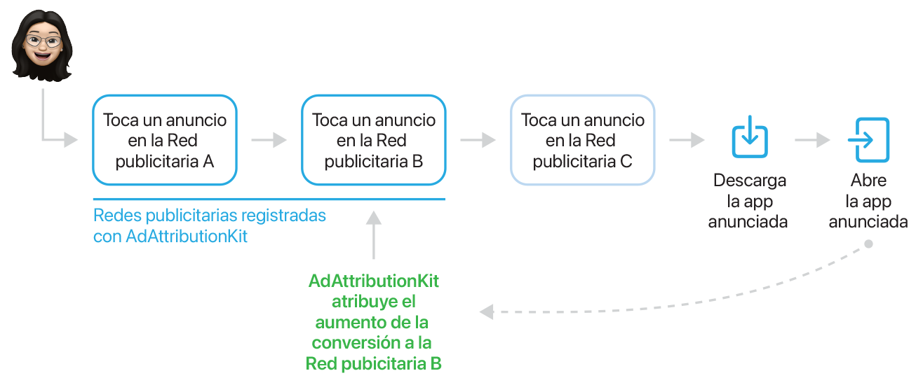 Con AdAttributionKit, la atribución de clics se produce cuando un usuario hace clic en un anuncio que lo lleva a esa app en el App Store de Apple y procede a instalar la app. Después de que el usuario abra la app, se envían los datos de atribución. Si un usuario hace clic en más de un anuncio, la conversión de clics atribuida se asignará al anuncio en el que más haya hecho clic el usuario. AdAttributionKit solo puede atribuir una conversión entre las redes publicitarias que están registradas, por lo que cuantas más redes publicitarias se unan, más precisos y útiles se volverán los datos de atribución.
