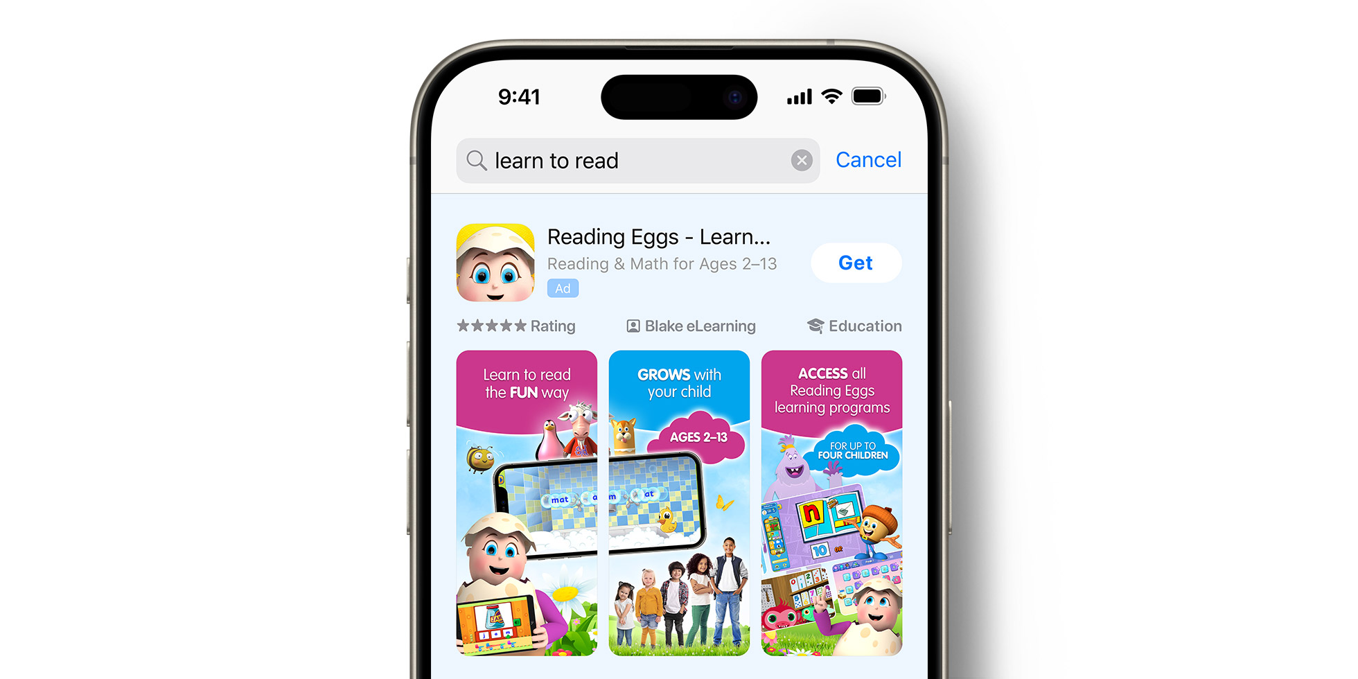 El equipo de Reading Eggs maximizó aún más la visibilidad de la marca invirtiendo en varias ubicaciones de anuncios de Apple Ads que complementaban su estrategia de resultados de búsqueda. Una ubicación destacada en la pestaña Hoy1 brindó la oportunidad de llegar a millones de clientes potenciales cuando iniciaban su recorrido en el App Store. Los anuncios de las pestaña Buscar2 les ayudaron a aumentar el conocimiento de la marca y a influir en la intención antes de que los clientes potenciales accedieran a una búsqueda específica.