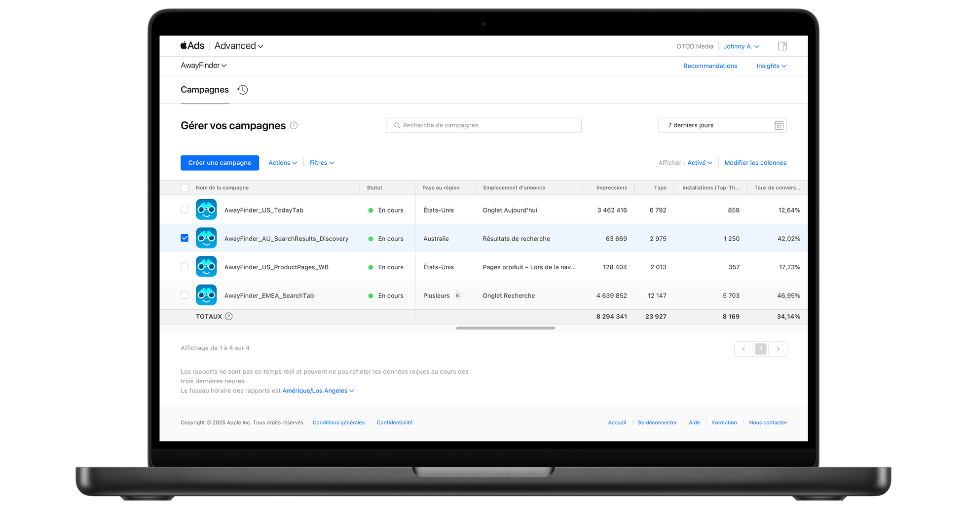 Les informations recueillies lors de la diffusion d’annonces dans les différents emplacements Apple Ads de l’App Store ont permis à nos équipes de stratégie de la marque, de recherche, de gestion organique et de conception de collaborer en bonne intelligence. Une stratégie Apple Ads à emplacements multiples nous a permis d’unifier nos objectifs en interne, en créant une synergie précieuse entre la notoriété de la marque et le marketing basé sur les conversions.