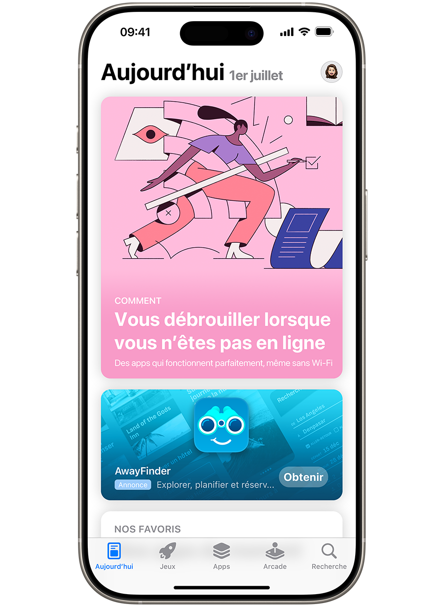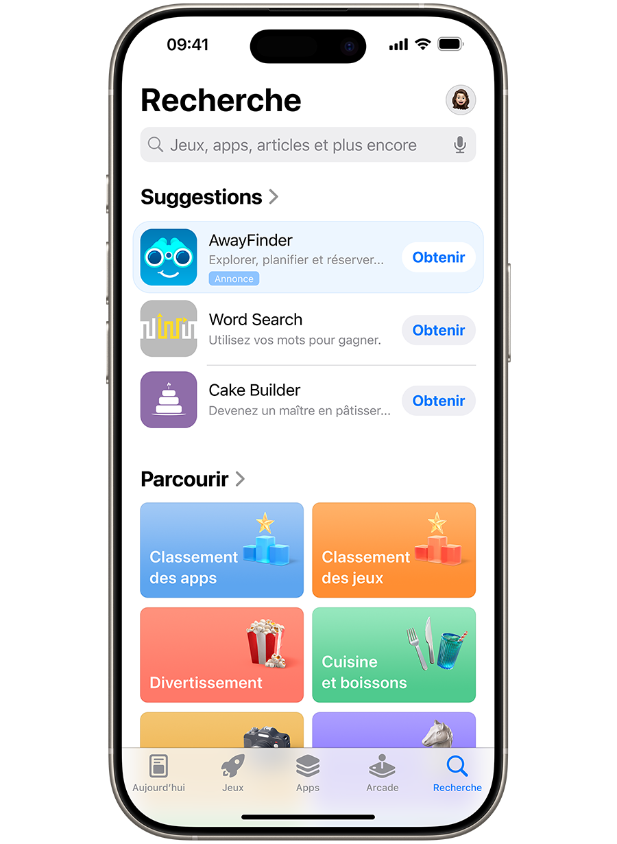 Faites votre promotion là où plus d’un demi-milliard de personnes partent à la recherche de nouvelles apps chaque semaine. Les annonces de l’onglet Aujourd’hui sont notre emplacement le plus important. Elles sont extrêmement visibles dès que l’on entre dans l’App Store et constituent une option de choix pour toucher les personnes qui n’auraient pas trouvé votre app autrement.