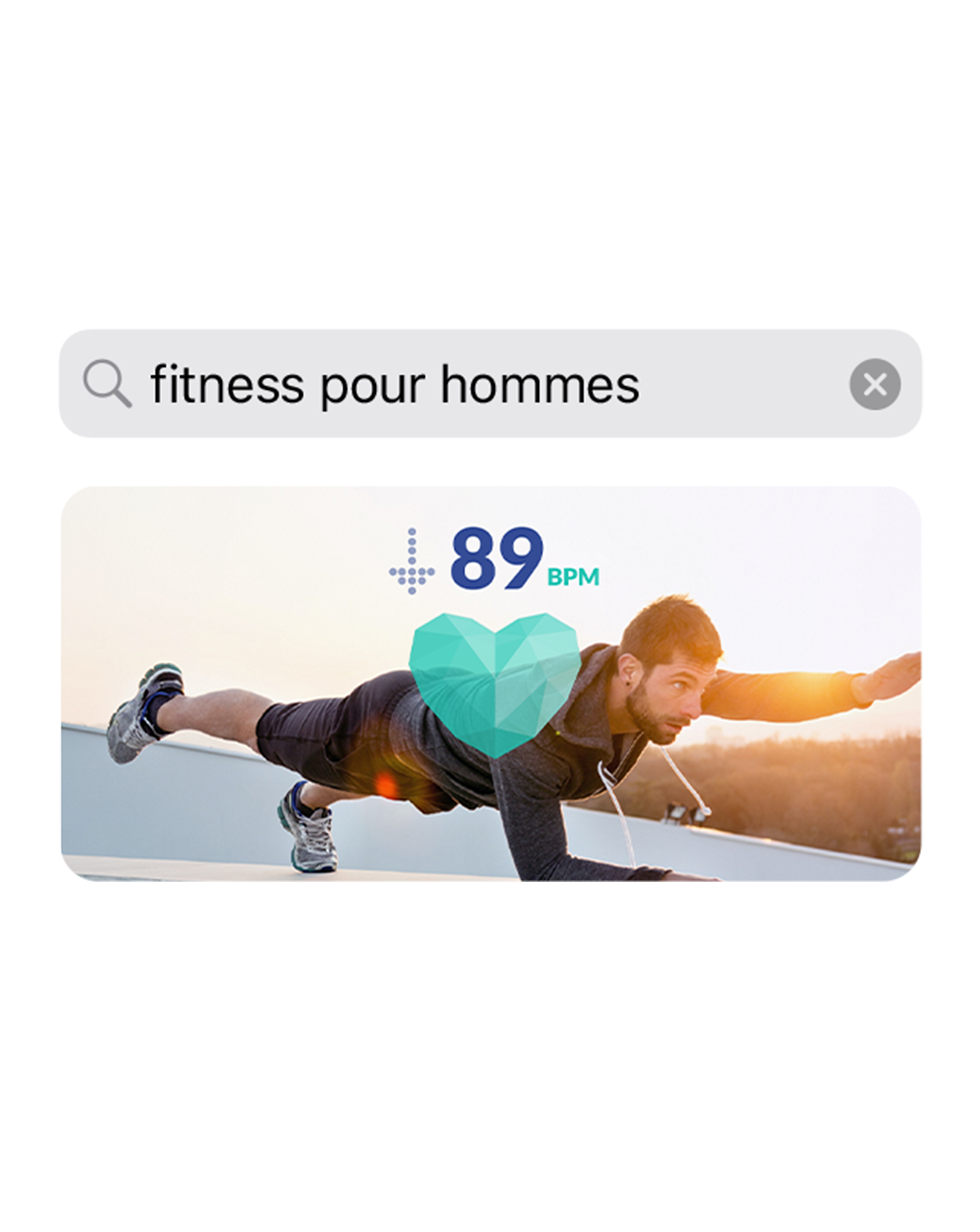 Ce sont les termes recherchés par les utilisateurs et les utilisatrices, et non les profils d’audience auxquels ils correspondent, qui constituent les plus forts signaux de leurs intérêts et intentions. Au lieu de modifier vos paramètres d’audience, améliorez la pertinence de votre annonce à l’aide d’éléments créatifs qui correspondent aux recherches effectuées. Pour promouvoir une app de fitness, par exemple, plutôt que de cibler une audience masculine, vous pouvez utiliser des captures d’écran montrant des hommes afin de refléter les recherches apparentées.