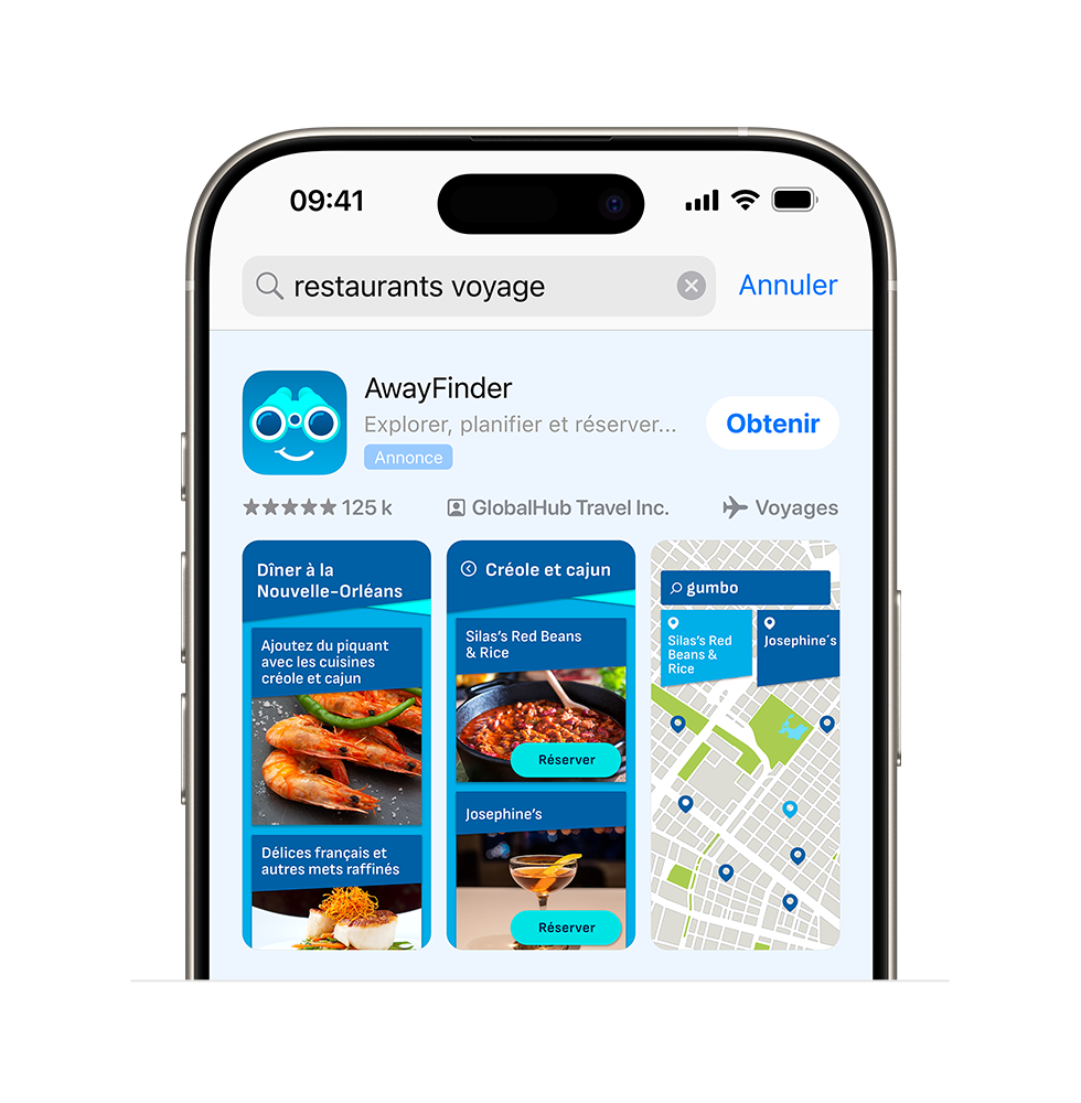 Imaginez que vous fassiez la promotion d’une app de voyage intitulée AwayFinder, avec un groupe d’annonces contenant des mots-clés comme restaurants voyage et expériences culinaires vacances. Vous pouvez créer une page produit personnalisée qui présente les fonctionnalités de votre app liées à la restauration, puis ajouter un lien ciblé qui redirige directement les personnes vers l’emplacement de votre app relatif à la restauration.