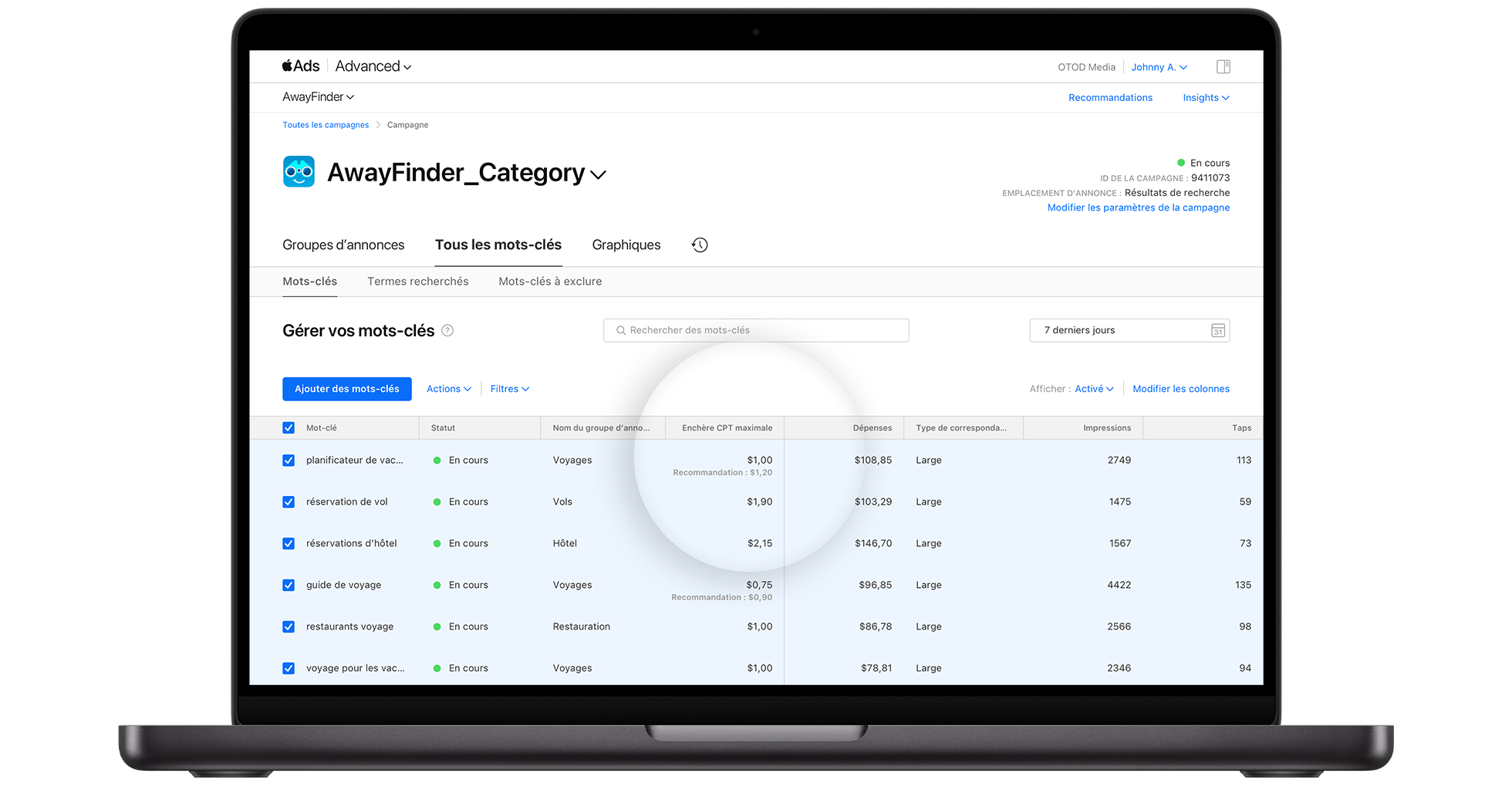 Vous pouvez voir des enchères recommandées sous la colonne Enchère CPT maximale du tableau de bord « Tous les mots-clés ». L’application de recommandations peut vous aider à améliorer la visibilité de votre annonce auprès de la clientèle. Dans l’exemple ci-dessous, vous pouvez voir une enchère recommandée pour une app de voyage nommée AwayFinder.