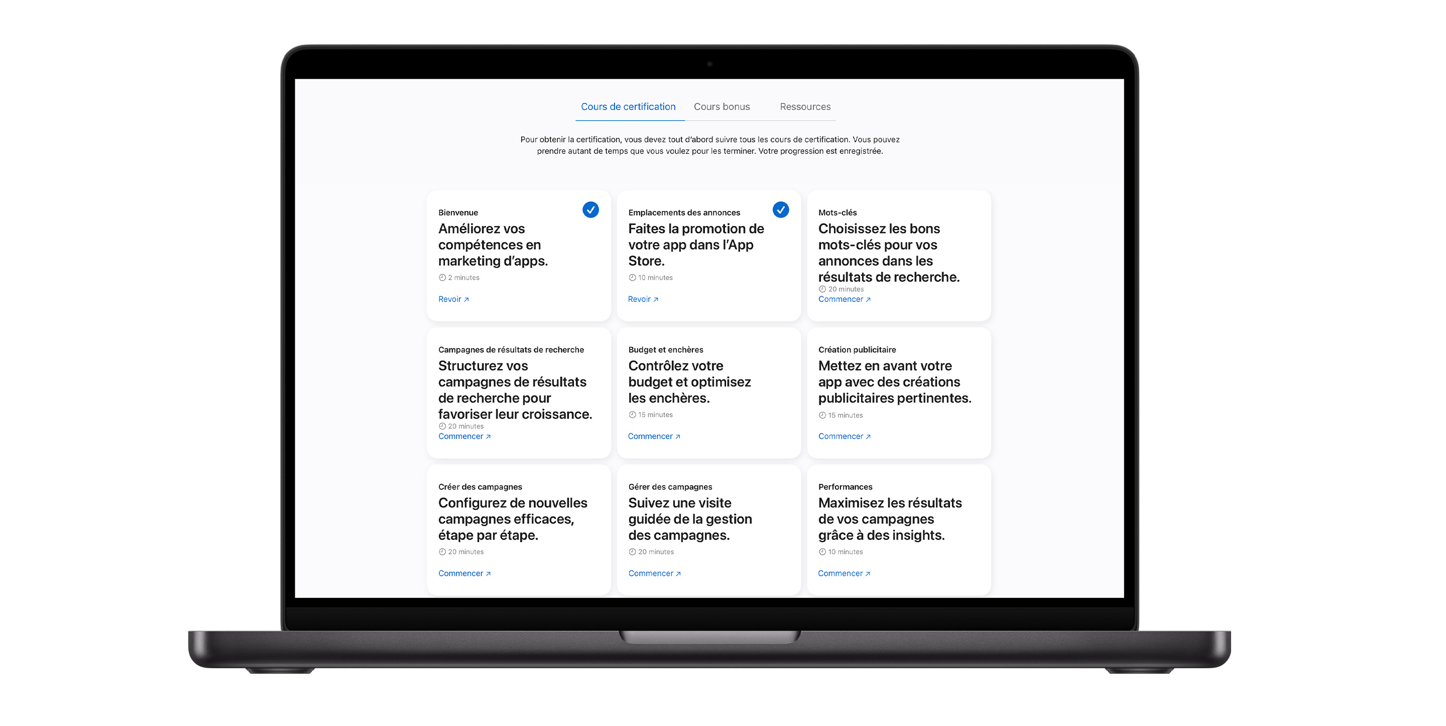 La certification Apple Ads est un cours en ligne gratuit qui vous permet d’apprendre à promouvoir efficacement votre app et à atteindre davantage de personnes sur l’App Store. D’une durée moyenne de 10 à 20 minutes, nos cours regorgent de bonnes pratiques éprouvées qui vous aideront à améliorer les performances de vos campagnes.