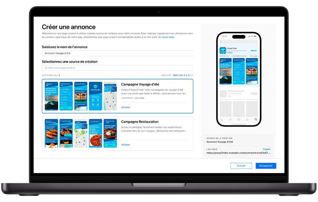Vous pouvez créer jusqu’à 70 pages produit personnalisées comportant différents aperçus vidéo de l’app, des captures d’écran, du texte promotionnel et des liens ciblés. Toutes vos pages produit personnalisées seront disponibles dans Apple Ads pour générer des variations d’annonces. Vous disposerez ainsi de nombreuses options pour créer des annonces plus pertinentes en fonction des différents profils d’utilisateurs.
