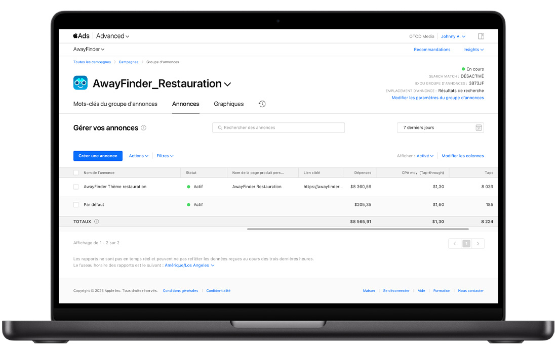 - Consulter les données de performances actuelles et historiques de toutes vos variations d’annonces, y compris votre annonce de résultats de recherche par défaut, vos annonces personnalisées, ainsi que les Creative Sets créés précédemment. Vous pouvez consulter des statistiques clés telles que les impressions, les touchers, le coût par tap moyen, les installations et d’autres encore.