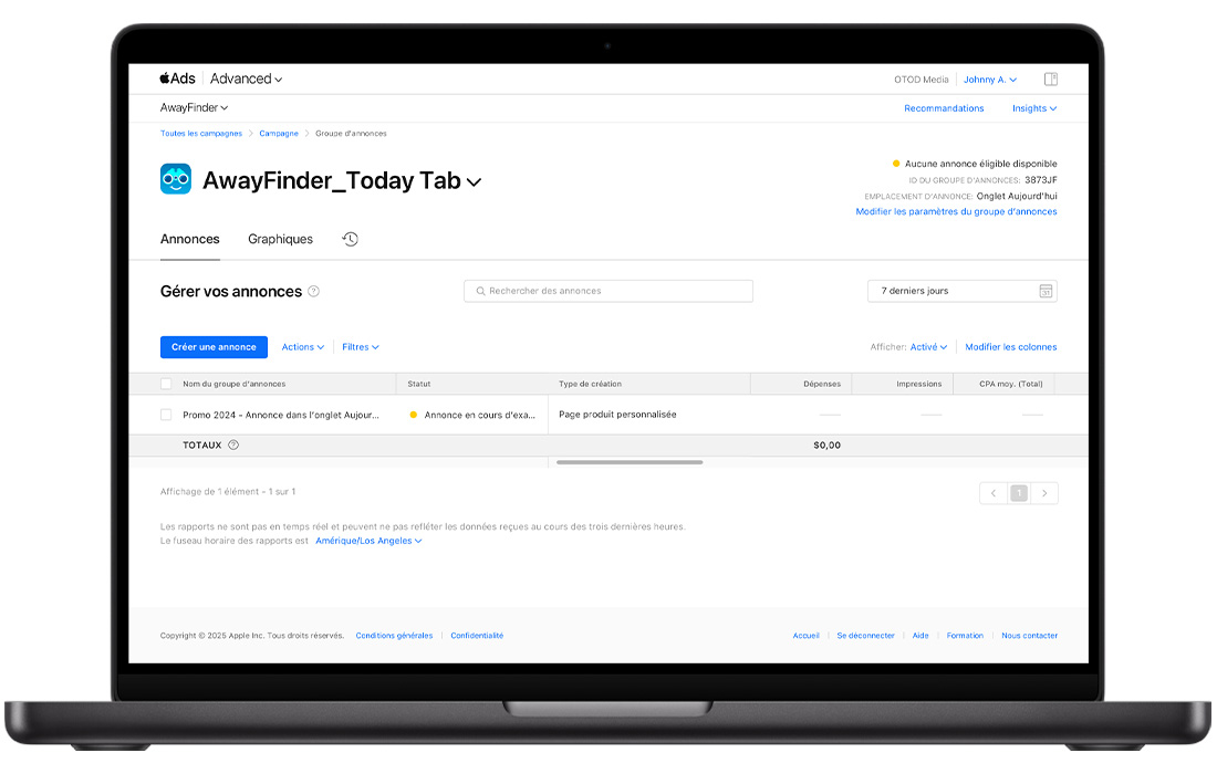 - Page produit personnalisée supprimée : Si la page produit personnalisée que vous avez sélectionnée est supprimée d’App Store Connect, votre annonce ne peut pas être diffusée.