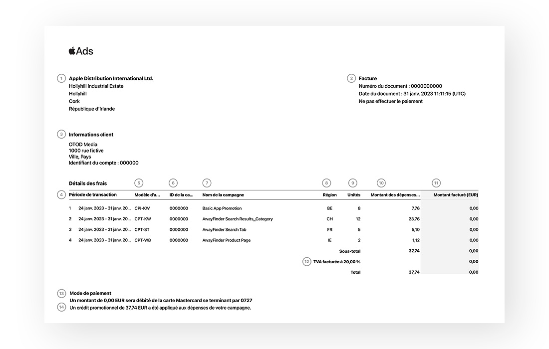 Un ID de campagne associé à chaque campagne et transaction Apple Ads Advanced apparaît dans la section Charge Details (Détails des frais) de votre facture. Si vous utilisez Apple Ads Basic, cette colonne indique un ID de promotion.